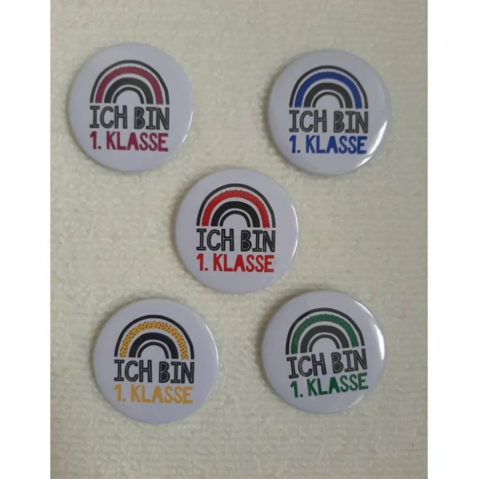 Der Button hat einen Durchmesser von ca. 5,9 cm. Der Button besteht aus einer Metallober- und Unterseite, auf der Rückseite befindet sich die Sicherheitsnadel.