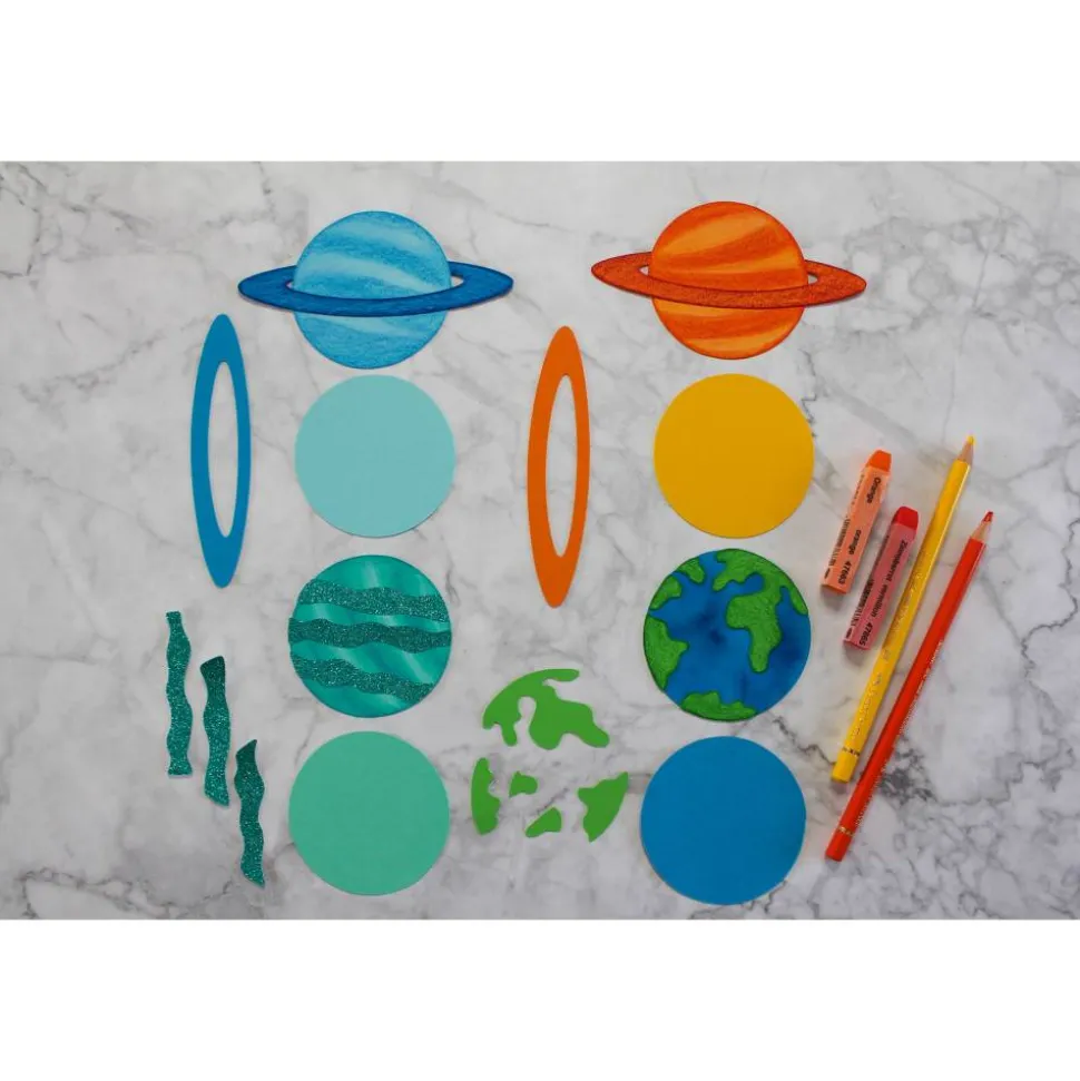 Rund um den Manschettenrand haben es sich die Planeten Erde, Saturn, ein Satellit und silberne Glitzersterne bequem gemacht.