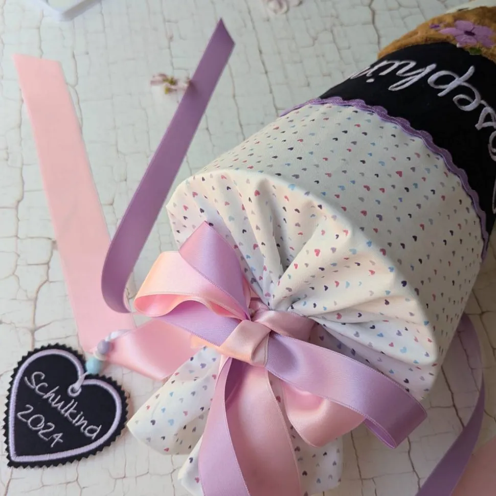 Auf Wunsch kannst du Farbe und Stoffmuster anpassen lassen. Die Schultüte bietet Platz für deinen Wunschnamen (auch Doppelnamen möglich) und auf Anfrage wird auch das Einschulungsdatum eingestickt. Wähle, ob der Name nebeneinander oder untereinander aufgestickt werden soll. Passende Herzanhänger und Innenkissen sind ebenfalls erhältlich.