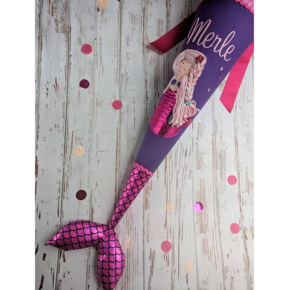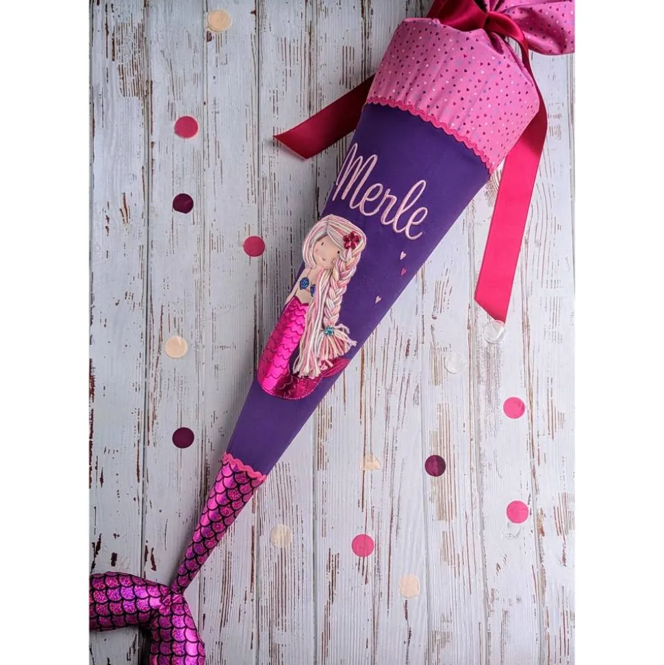 Die zauberhafte Schultüte mit aufgestickter Meerjungfrau und Flosse ist ein echter Blickfang und wird exklusiv für dich aus hochwertigen, nach Ökotex-Standard 100 zertifizierten Baumwollstoffen gefertigt. Jeder Name wird individuell aufgestickt und macht die Zuckertüte zu einem ganz persönlichen Unikat. Auch das Einschulungsdatum kann gegen Aufpreis hinzugefügt werden. Wähle, ob der Name nebeneinander oder untereinander erscheinen soll!