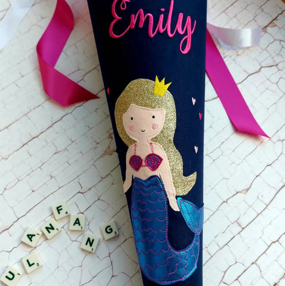 Das Motiv und der Name werden nach der Bestellung aufgestickt. Die Größe des Namens kann durch die Anzahl der Buchstaben variieren. Lange Namen werden also etwas kleiner. Das gleiche gilt für Doppelnamen (Aufpreis). Bitte geben Sie hier an, ob die Namen nebeneinander oder untereinander aufgestickt werden sollen. Auf Wunsch kann auch das Einschulungsdatum aufgestickt werden (Aufpreis). Den abgebildeten Herzanhänger (Aufpreis) fertige ich passend aus den Stoffen der Schultüte an.