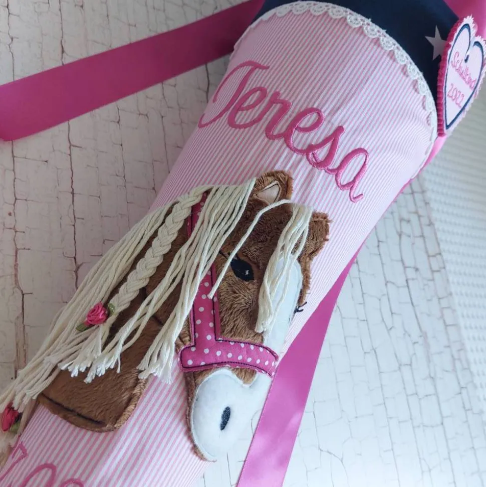 Das Motiv und der Name werden nach der Bestellung aufgestickt. Die Größe des Namens kann durch die Anzahl der Buchstaben variieren. Lange Namen werden also etwas kleiner. Das gleiche gilt für Doppelnamen (Aufpreis). Bitte geben Sie hier an, ob die Namen nebeneinander oder untereinander aufgestickt werden sollen. Auf Wunsch kann auch das Einschulungsdatum aufgestickt werden (Aufpreis). Den abgebildeten Herzanhänger (Aufpreis) fertige ich passend aus den Stoffen der Schultüte an.