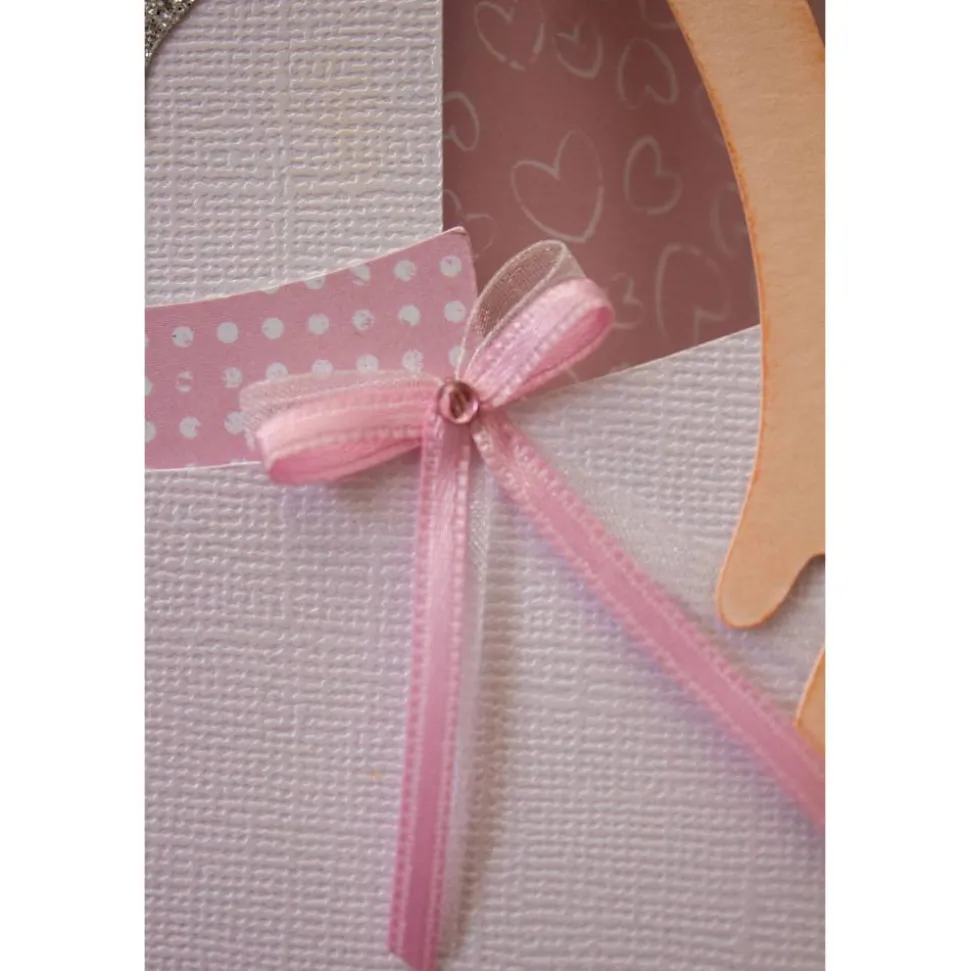 Der Schultütenrohling ist mit einem rosafarbenen Herzmotivkarton um klebt. Die Spitze und die Ornamente am Manschettenrand sind aus einem leicht glänzenden, weißen Strukturkarton abgesetzt. Die Manschette besteht aus zwei Lagen. Ein besonderer Hingucker ist der weiße Tüll, mit silberfarbenen Glitzerpartikeln, der das weiße Krepppapier überdeckt. Verschlossen wird die Manschette mit einem rosa Satinband und pinkfarbenem Organzaband. Für einen sauberen Übergang sorgt eine weiße Bordüre, eine pinkfarbenen Holzspitze bildet den Abschluss. Eine Verzierung mit silberfarbenen Glitzerherzen und rosa Schmucksteinen runden den oberen Teil ab.