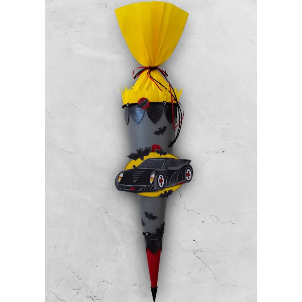 Der Schultütenrohling ist mit einem leicht glänzenden, grauen Strukturkarton um klebt. Die Spitze ist aus rotem Fotokarton gefertigt. Die Ornamente am Manschettenrand und der Spitze sind aus Folie in Carbon Optik gearbeitet und mit Fotokarton verstärkt. Für einen sauberen Übergang sorgt eine schwarze Bordüre, eine schwarze Holzspitze bildet den Abschluss. Die Manschette ist aus gelbem Krepppapier und wird mit einem roten Satinband und schwarzer Kordel verschlossen. Eine Verzierung mit kleinen Schraubmuttern und Fledermäusen, runden den Schultütenrohling ab.