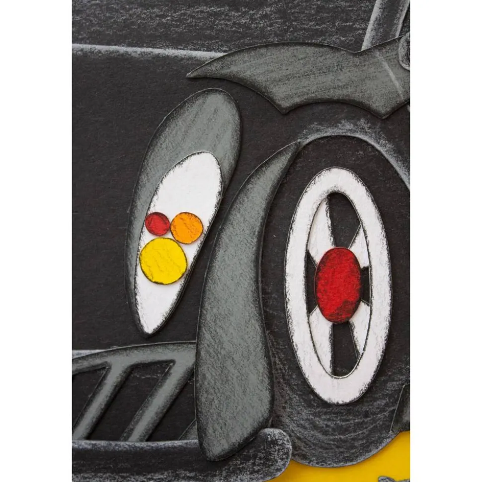 Das „Batmobil“, als Hauptmotiv, ist aus diversen Fotokartonfarben, in liebevoller Kleinarbeit, plastisch gefertigt. Ein wiederkehrendes Farbenspiel sorgt für ein harmonisches Gesamtbild.