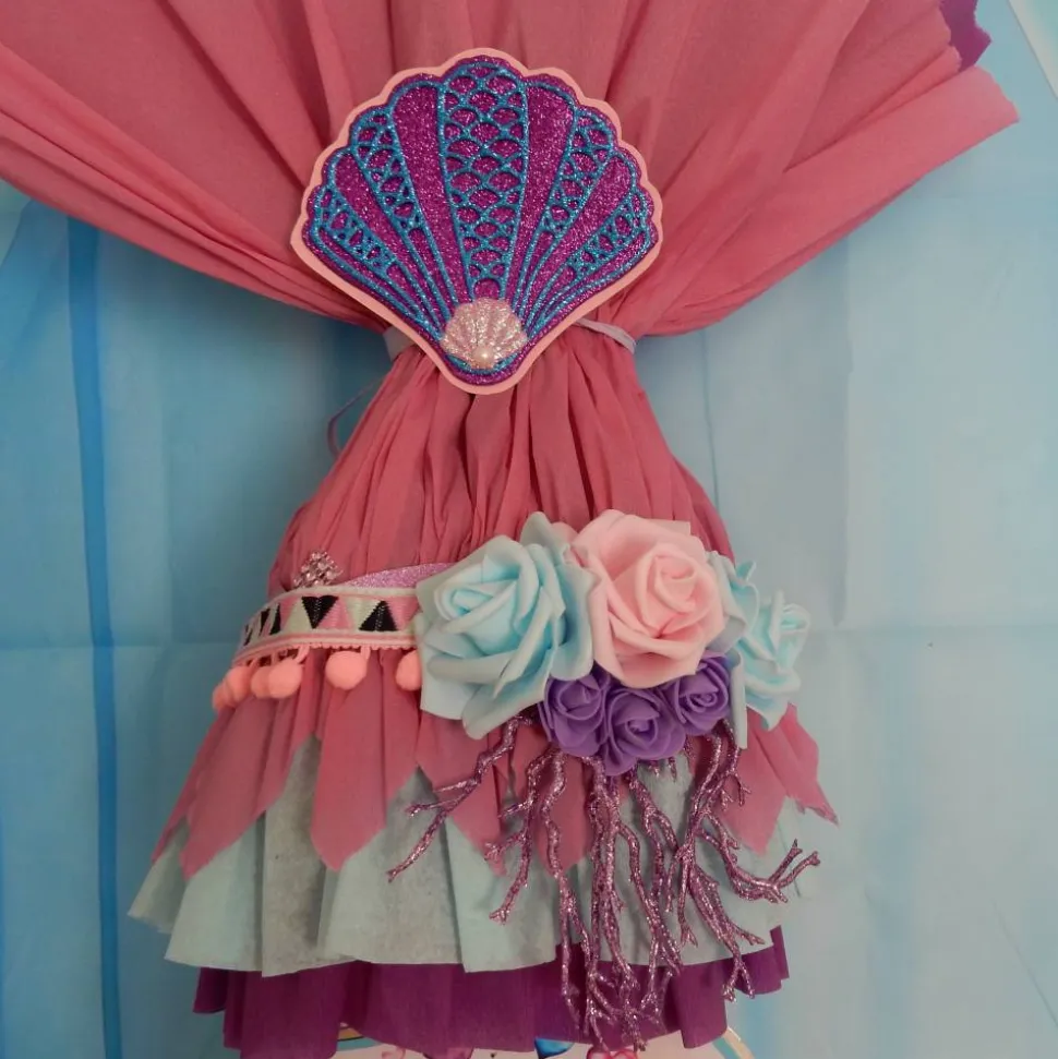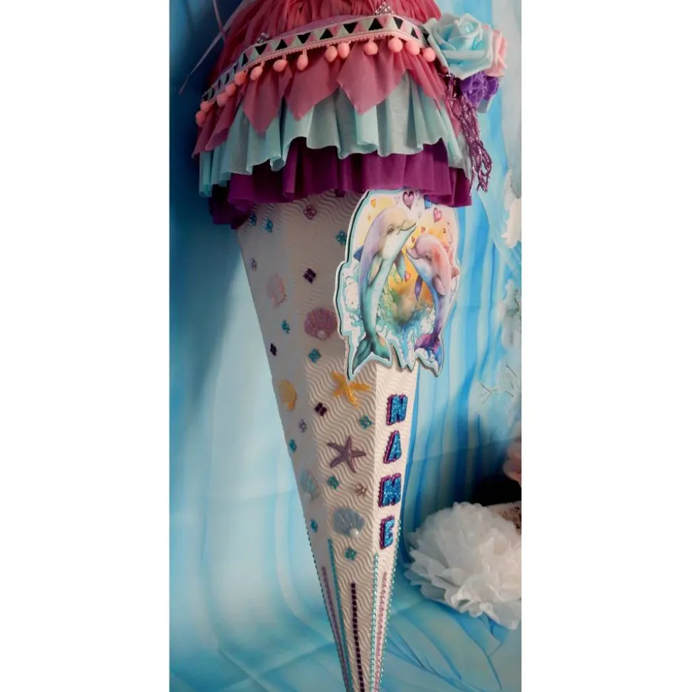 Tauche ein in eine zauberhafte Unterwasserwelt! Diese handgefertigte Schultüte begeistert mit ihrem liebevollen Meerjungfrauen-Design und detailreichen Verzierungen. Der aufwendig gestaltete Verschluss aus rosafarbenem und lilafarbenem Krepppapier wird von einer glitzernden Muschel-Applikation gekrönt. Wunderschöne Stoffblumen und funkelnde Bänder verleihen der Schultüte einen märchenhaften Look.