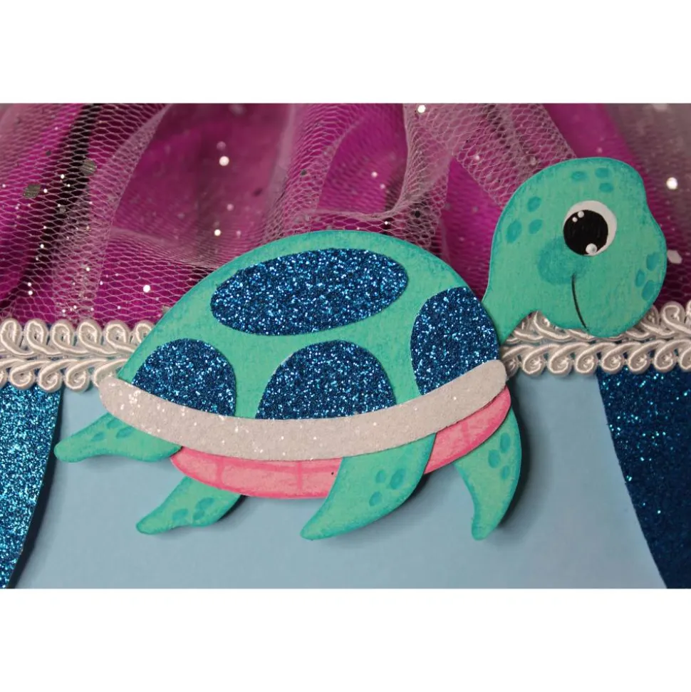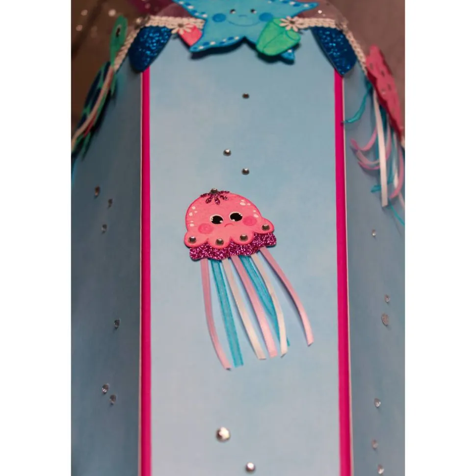 Eine Verzierung aus niedlichen Quallen, Schildkröten, Seesternen, Algen und Blüten umrunden den Schultütenrohling. Sie sind aus rosa, mint und pastellblauem Fotokarton gearbeitet. Einzelne Elemente setzen sich aus Glitterkarton in pink, türkis und weiß ab und sind teilweise mit Schmucksteinen verziert. Diese finden sich auch auf den Bordüren und rund um den Schultütenrohling, in verschiedenen Größen, wieder.