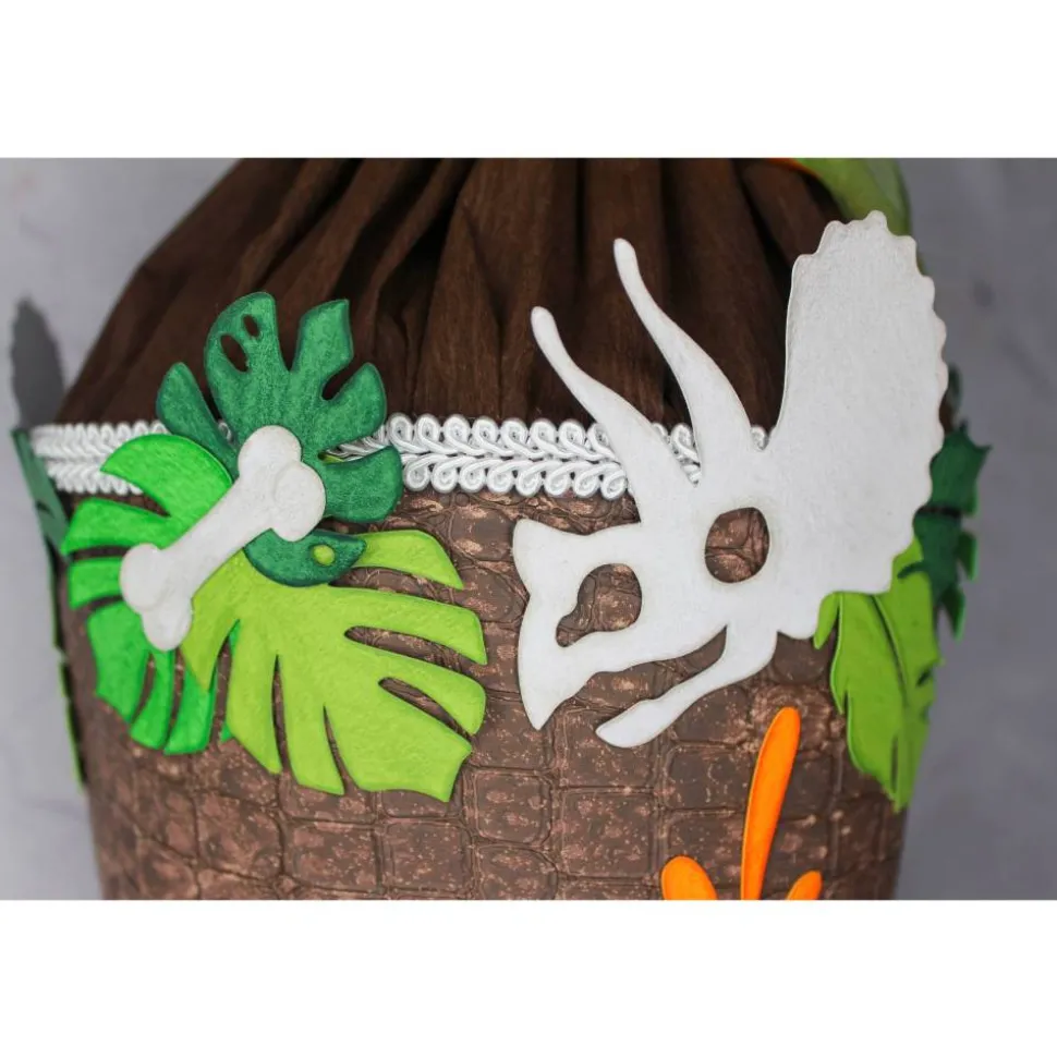 Viele tropische Blätter, in drei Grüntönen, Knochen und Skelette von Dinosaurierköpfen zieren den Schultütenrohling und sind aus Fotokarton gefertigt.
