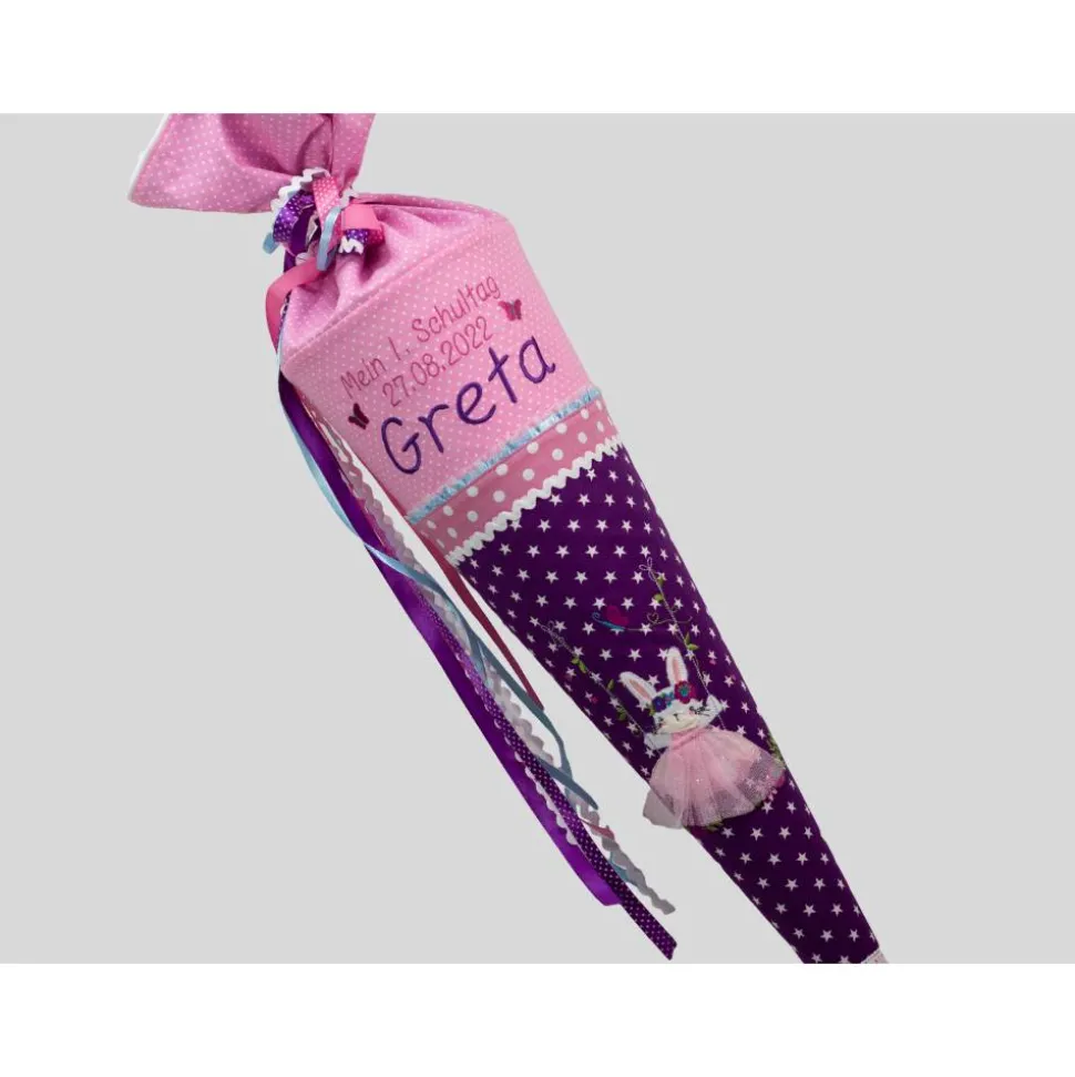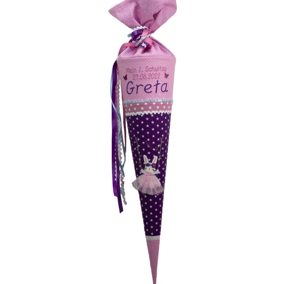Die klassisch runde Schultüte hat eine perfekte Größe für Leckereien und kleine Geschenke zum Schulstart und wird inklusive eines 70 cm großen Papprohlings geliefert. Der Verschluss oben ist zusätzlich ca. 30 cm lang und wird entweder mit einer passenden Baumwollschleife oder mehreren Satinbändern geschlossen. Gesamtlänge der Schultüte beträgt ca. 100 cm.