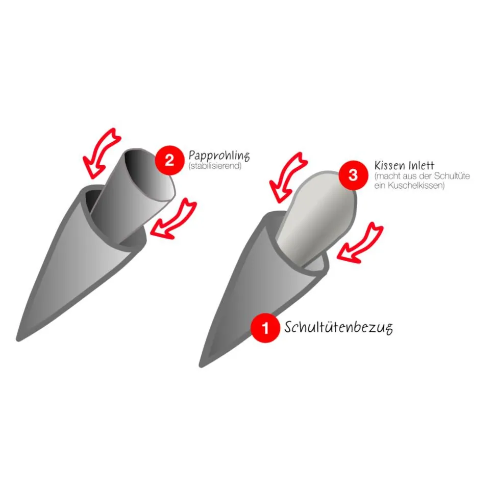 Bestellen Sie ganz bequem das komplette Zubehör für Ihre Schultüte von zu Hause. In unserem Shop können Sie direkt einen passenden Schultüten Rohling und ein passendes Schultüten Kissen Inlett mit bestellen. Ziehen Sie den Schultütenbezug ganz einfach über den Papprohling. Da der Bezug vom Rohling leicht abzunehmen ist, können Sie ihn auch problemlos waschen. Damit Ihr Kind seine Schultüte auch nach der Einschulung noch benutzen kann, können Sie sie mit unseren Schultüten Kissen Inletts ganz schnell zu einem Kuschelkissen verwandeln. Wählen Sie dazu einfach das passende Zubehör aus.