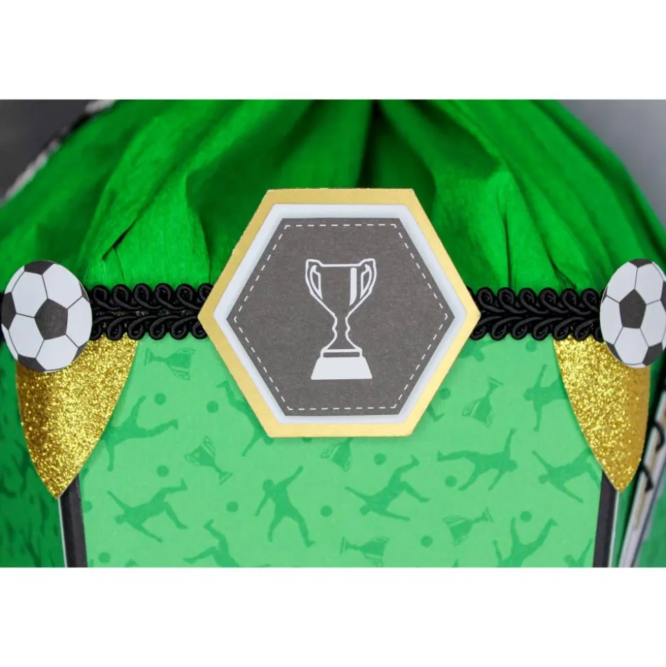Der 6-eckige, schwarze Rohling ist auf allen Seiten mit einem Fußballmotivkarton in Grüntönen beklebt. Die Spitze aus Motivkarton setzt sich passend zum Thema, als schwarz-weiße Fußballrauten ab, eine grüne Holzspitze bildet den Abschluss. Die kleinen Ornamente am Manschettenrand und der Spitze sind aus goldenem Glitterkarton gefertigt, für einen sauberen Übergang sorgt eine schwarze Bordüre. Die Manschette ist aus schwarz und grünem Krepppapier gefertigt und wird mit einer weißen Kordel und einem schwarzem Satinband verschlossen.