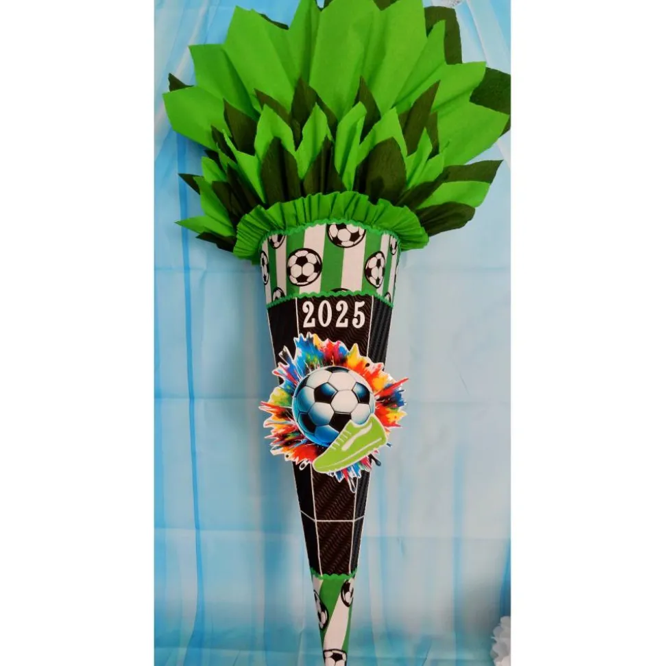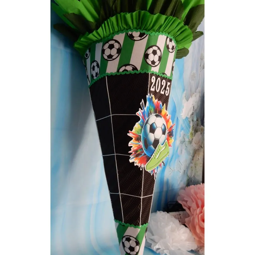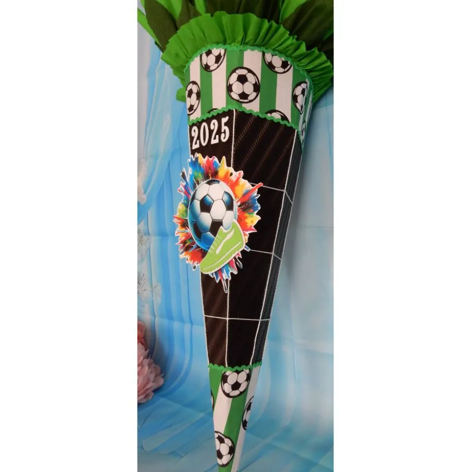 Mit dieser einzigartigen Schultüte wird der erste Schultag zu einem unvergesslichen Erlebnis! Das auffällige Fußball-Design begeistert mit kräftigen Grün- und Schwarztönen, dynamischen Fußballmotiven und dem großen „2025“-Schriftzug. Ein farbenfroher 3D-Fußball mit leuchtenden Effekten macht die Schultüte zu einem echten Blickfang auf dem Schulhof.