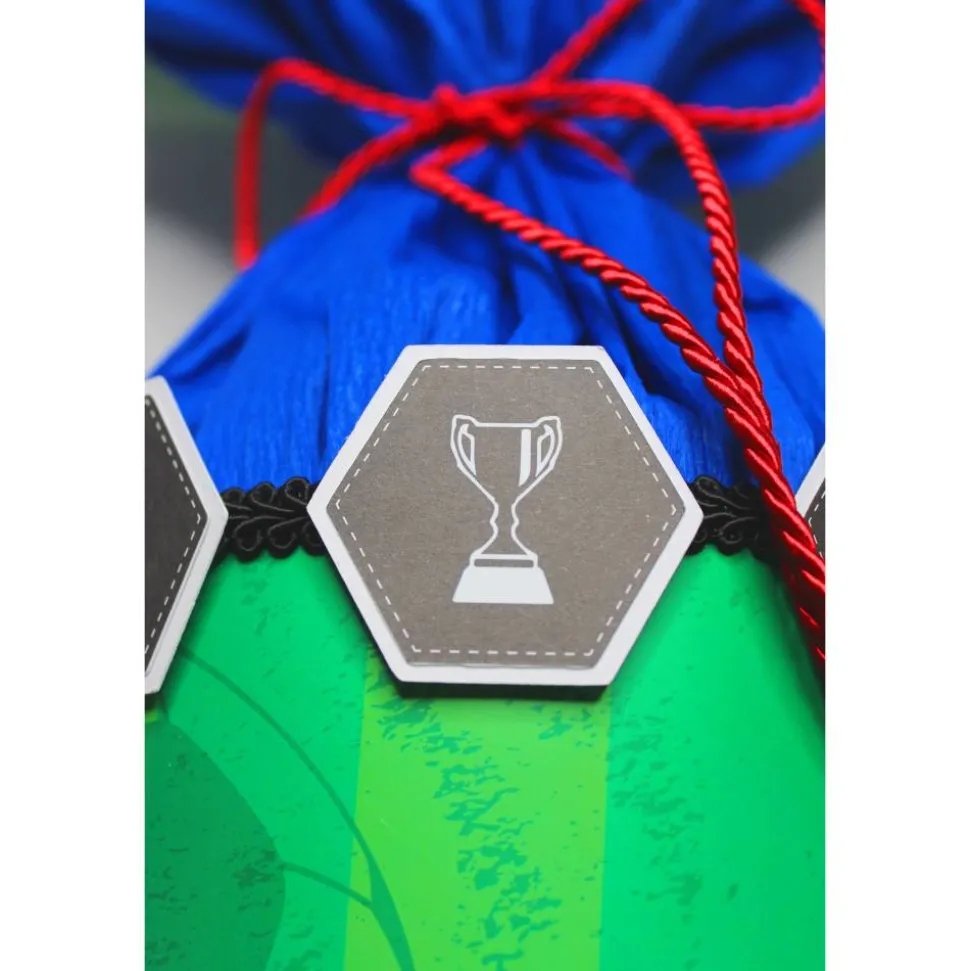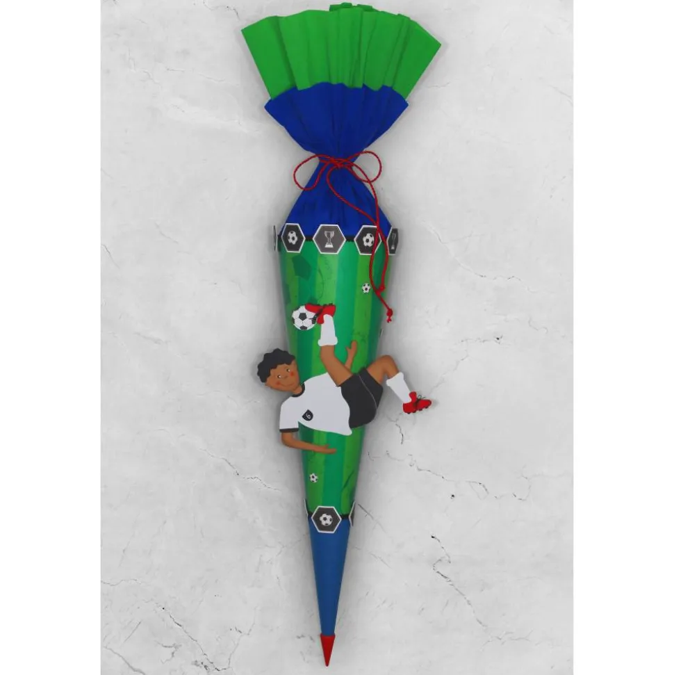 Der Schultütenrohling ist mit einem Motivkarton in Spielfeldoptik um klebt. Die Spitze ist aus blauem Fotokarton gefertigt, eine rote Holzspitze bildet den Abschluss. Die Manschette ist aus grünem und blauem Krepppapier gefertigt und wird von einer roten Kordel verschlossen. Für einen sauberen Übergang sorgt eine schwarze Bordüre. Am Manschettenrand und der Spitze sind Sechsecke mit Fußball.- und Pokal Symbolen dekoriert. Rund um den Schultütenrohling sind kleine Fußbälle platziert.