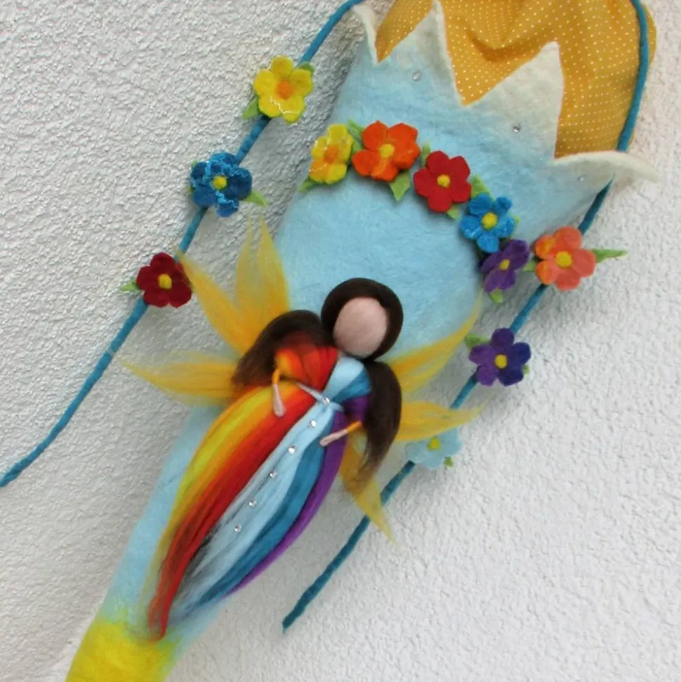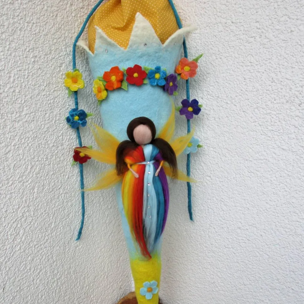 Diese Schultüte – Zuckertüte ist in aufwändiger Detailarbeit handgefilzt – geschmückt mit einer handgefilzten Elfe im Regenbogendesign.