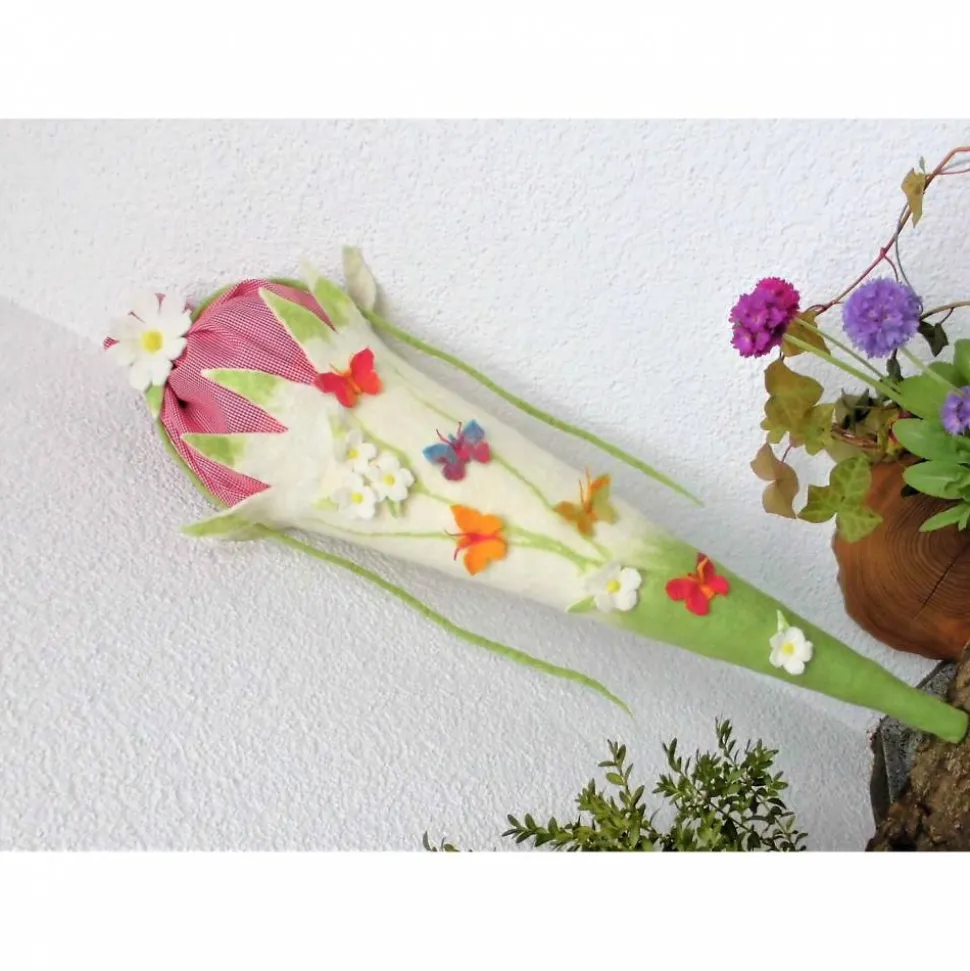 Der Schultütenkörper ist in altweiß und grün gehalten, daraufsind grüne Ranken eingefilztauf denen fröhlich bunte Schmetterlinge sitzen.
