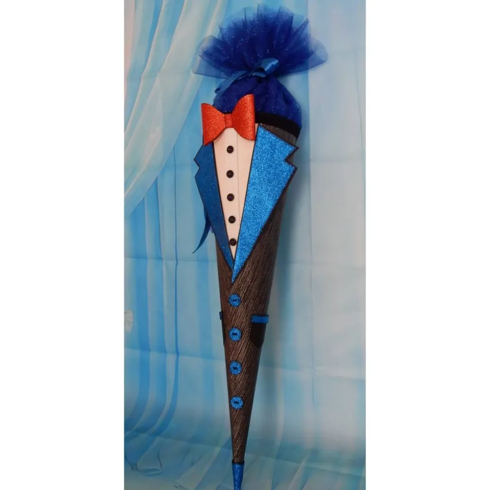 Diese Schultüte ist ein echter Hingucker und ideal für den ersten Schultag! Sie besteht aus stabilem Papier und ist mit viel Liebe zum Detail gestaltet. Das Design erinnert an ein stilvolles Outfit, komplett mit einem blauen Glitzer-Look, einer roten Fliege und dekorativen Knöpfen. Der obere Abschluss der Schultüte ist mit edlem, blauem Tüll versehen, der das Gesamtbild perfekt abrundet.