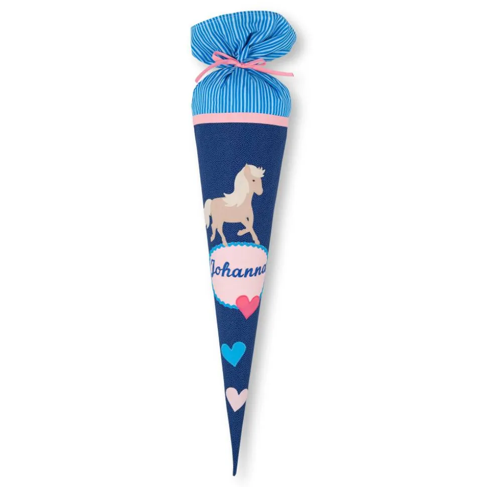 Handgefertigte Schultüte aus Stoff . Detailverliebt bestickt mit Pferd und Pompoms.