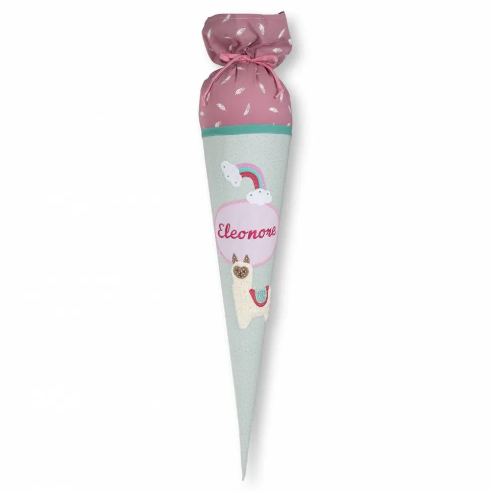 Handgefertigte Schultüte aus Stoff in den tollen Farben Altrosa und Lindgrün . Detailverliebt bestickt mit einem flauschigen Lama und Regenbogen.