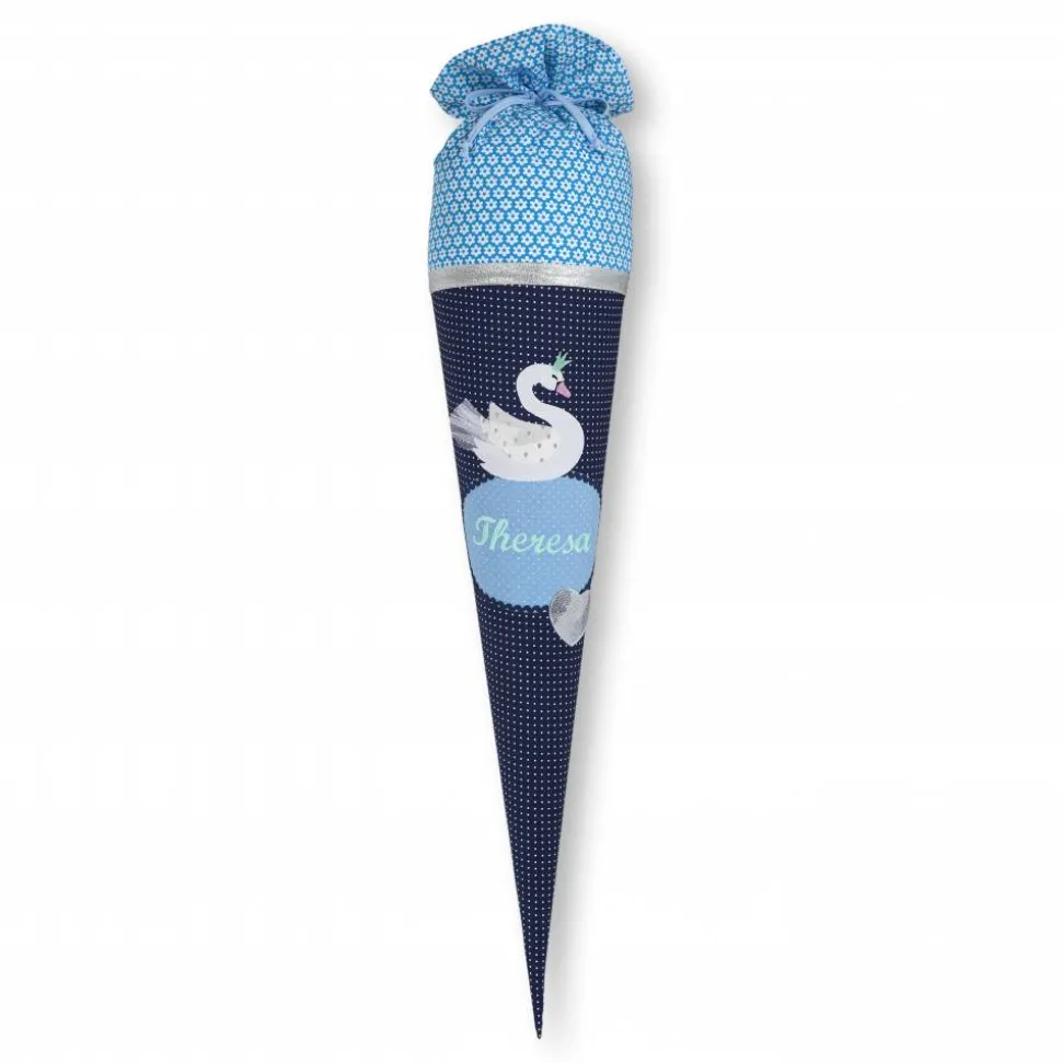Handgefertigte Schultüte aus Stoff in den tollen Farben Dunkelblau und Türkis . Detailverliebt bestickt mit Schwan.