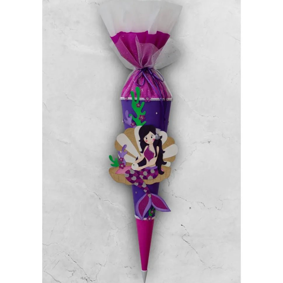 Der Rohling ist mit lilafarbenem Fotokarton um klebt. Die Spitze ist aus pinkfarbenem Fotokarton gefertigt. Die Manschette besteht aus drei Lagen. Ein besonderer Hingucker ist der weiße Tüll, mit silberfarbenen Glitzerpartikeln, der das violette und weiße Krepppapier in den Hintergrund rückt. Verschlossen wird die Manschette mit einem lila Satinband und einer lila Kordel. Für einen sauberen Übergang sorgt eine weiße Bordüre, eine weiße Holzspitze bildet den Abschluss. Eine Verzierung mit pinkfarbenen Glitzerblüten und kristallklaren Schmucksteinen, runden den Schultütenrohling ab.