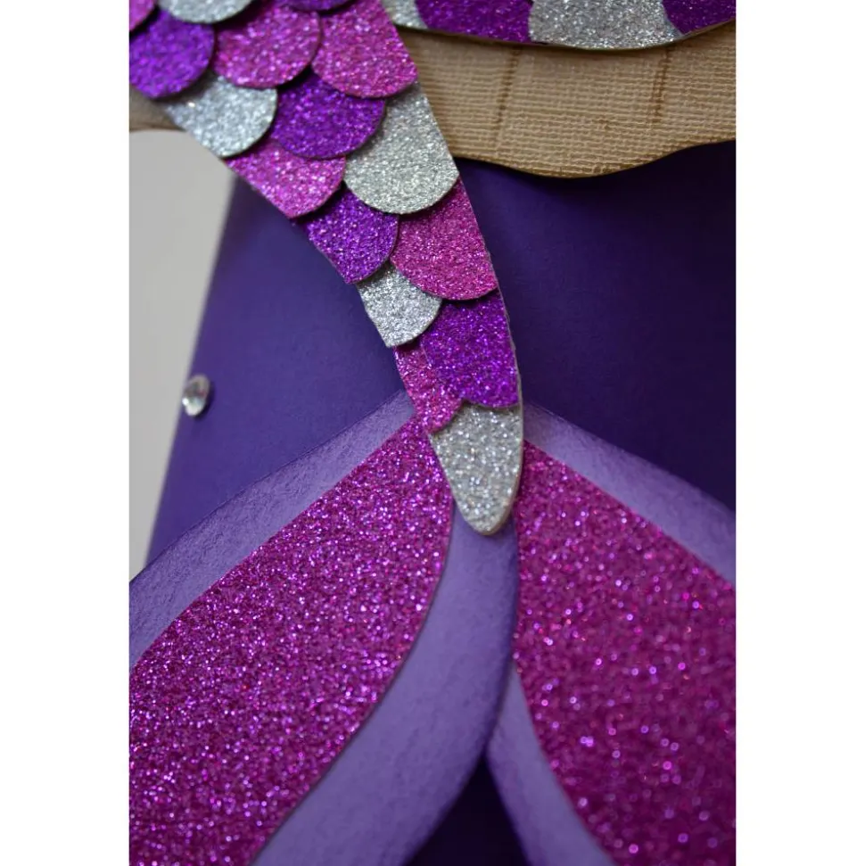 „Bella“ hat eine wahlweise blonde oder schwarze, wallende Mähne. In ihrem Haar spiegelt sich der weiße Tüll als Haarschleife wieder. Silber, pink und lilafarbene, glitzernde Schuppen ziehen sich bis zur Schwanzflosse, die sich in flieder und glitzerpink absetzt. Das glitzerpinke Oberteil ist mit lila Schmucksteinen verziert. „Bellas“ Muschel ist aus einem leicht glänzendem, beigen Strukturkarton hergestellt. Die einzelnen Elemente setzen sich in einem glitzernden Weiß ab. Kleine Algen aus fliederfarbenem und grünem Fotokarton, die mit Blüten zusätzlich verziert sind, runden das harmonische Gesamtbild ab.