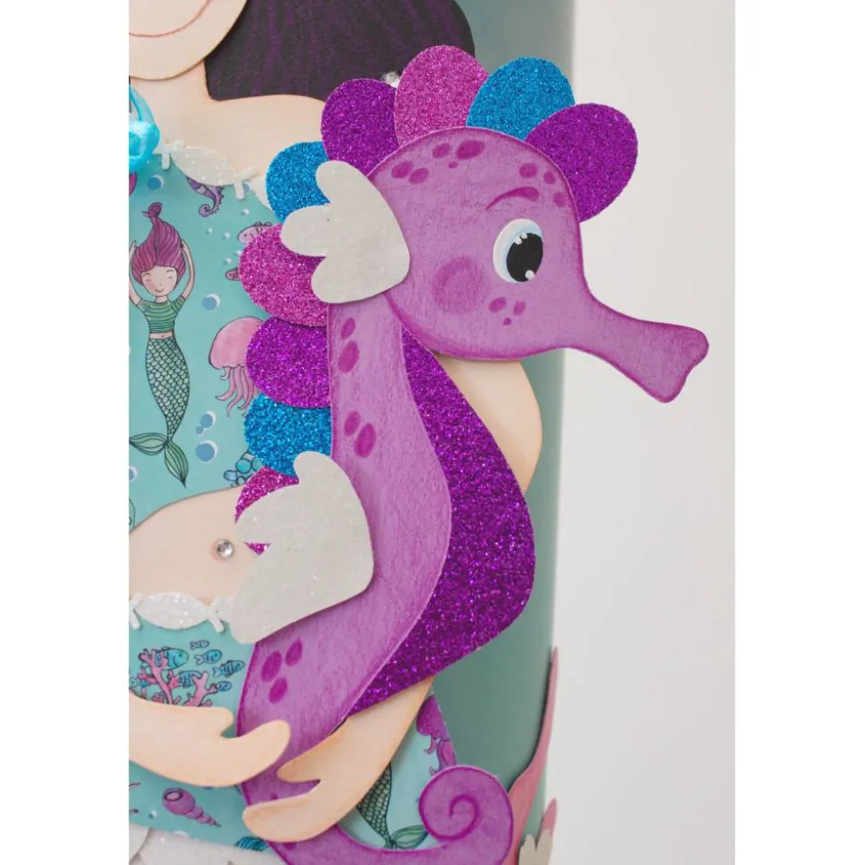 Der Schultütenrohling ist mit einem Motivkarton in hellblauer Aquarelloptik um klebt. Die Spitze ist aus einem Motivkarton mit Meerjungfrauen gefertigt. Die Manschette besteht aus drei Lagen. Ein besonderer Hingucker ist der rosa Tüll, mit rosa Glitzerpartikeln, der das weiße und violette Krepppapier in den Hintergrund rückt. Verschlossen wird die Manschette mit einen türkisen Satinband und Organzaband. Für einen sauberen Übergang sorgt eine weiße Bordüre, eine weiße Holzspitze bildet den Abschluss. Eine Verzierung aus Seesternen, Muscheln, Algen und Blüten umrunden den Schultütenrohling. Sie sind aus rosa, flieder und hellblauem Fotokarton und Glitterkarton in pink, lila, türkis und weiß gearbeitet, kristallklare Schmucksteine runden den Schultütenrohling ab.