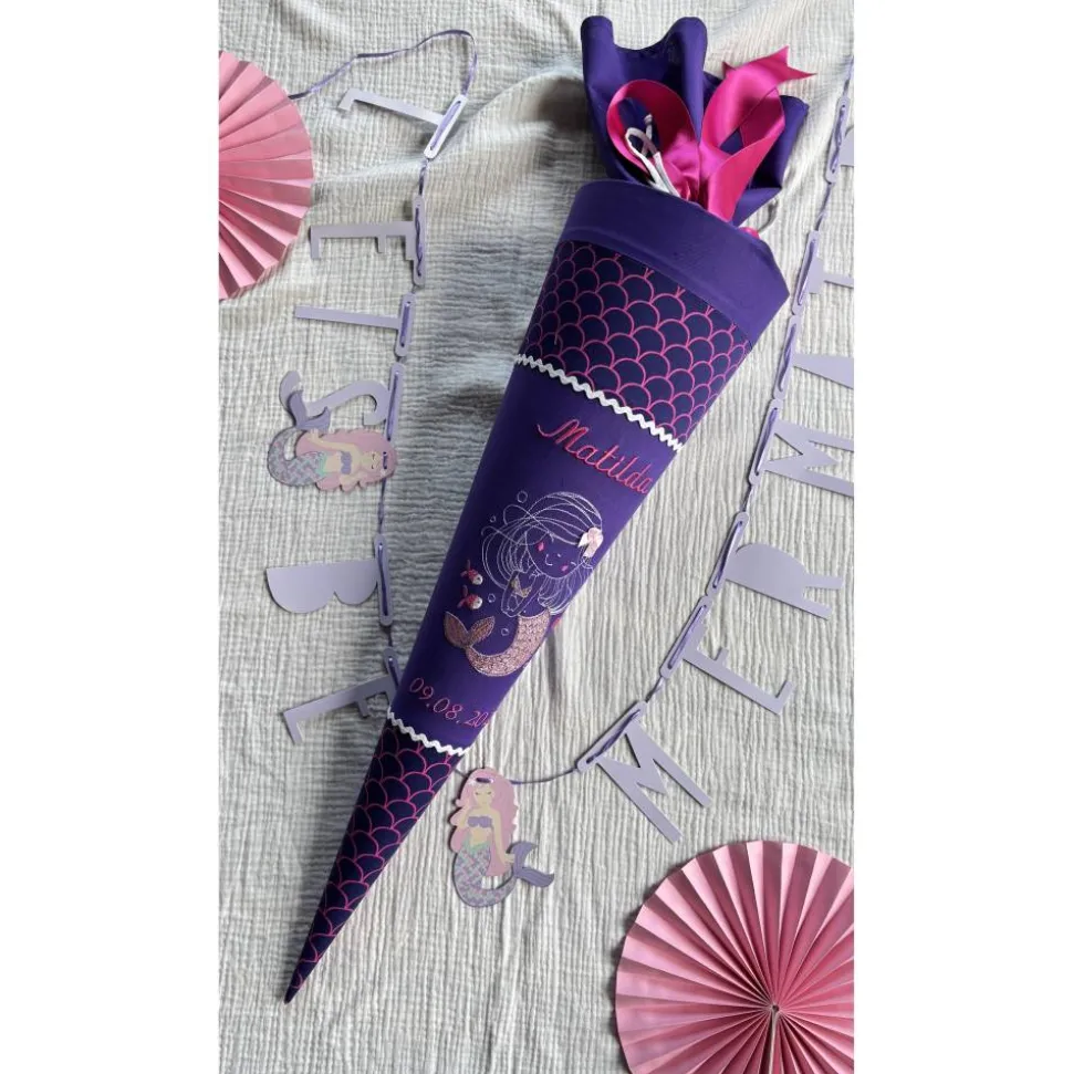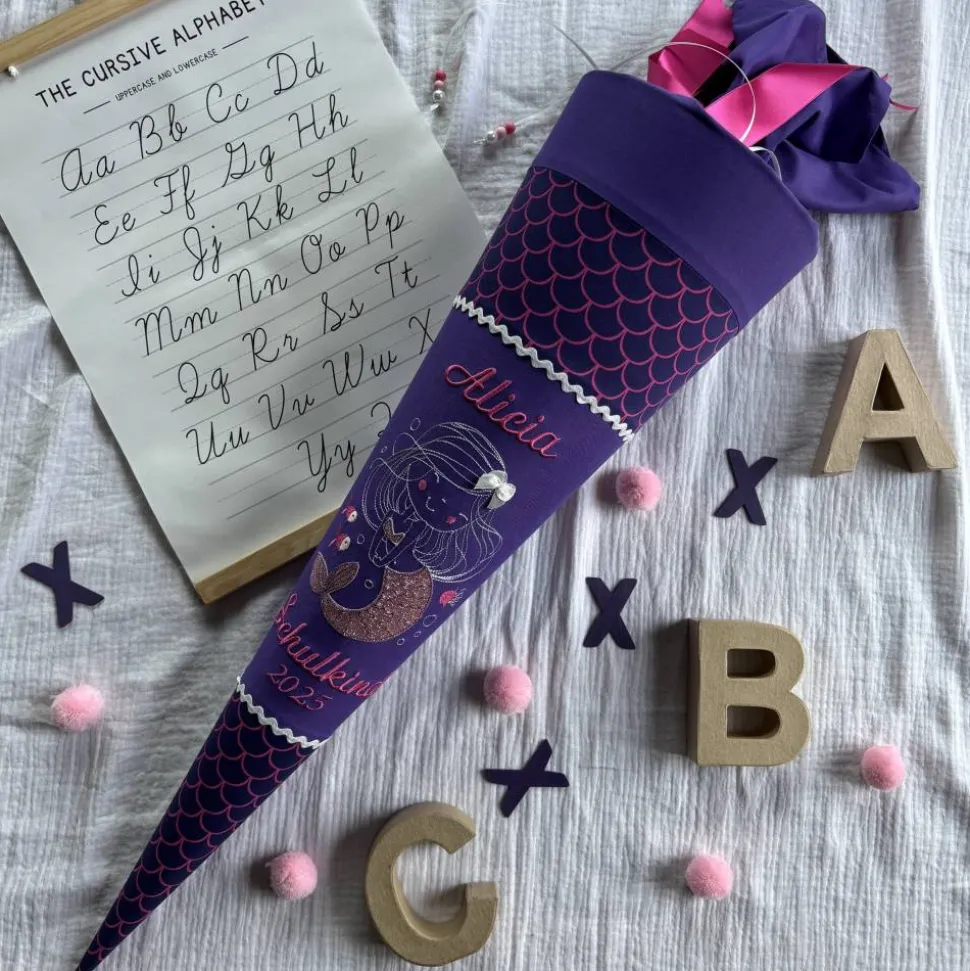 Diese Schultüte ist passend zum ergobag Schulranzen Perlentauchbär gestaltet. Der passende rosa und Akzente in mint, sowie Motiv Meerjungfrau ist beim Schulranzen ein Blickfang. Die Figur von dem Meerjungfrau ist einer der Lieblingsmotiven für Mädchen, so ist auch diese Schultüte unser Bestseller geworden. Mit der Größe 70 oder 85 cm ist sie der Klassiker und bietet genügend Platz für Geschenke zum Schulstart. Auf deinen Wunsch kann auch Einschulungsdatum eingestickt werden. Ergänzend dazu kann auch Kissen bestellt werden, das nach den großen Tag des Schulanfängers zum Erinnerungsstück zum Kuscheln umgewandet werden kann.