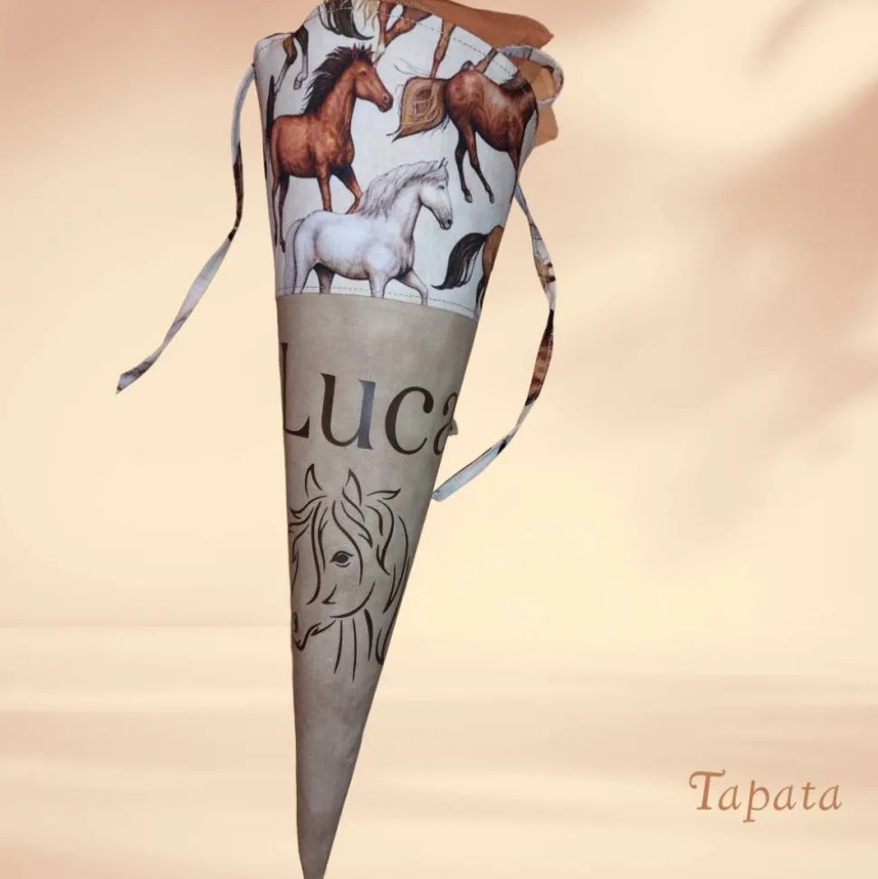 Braun mit Motiven von Pferden. Name und Motiv aufgebügelt mit Flexfolie (Plottertechnik).