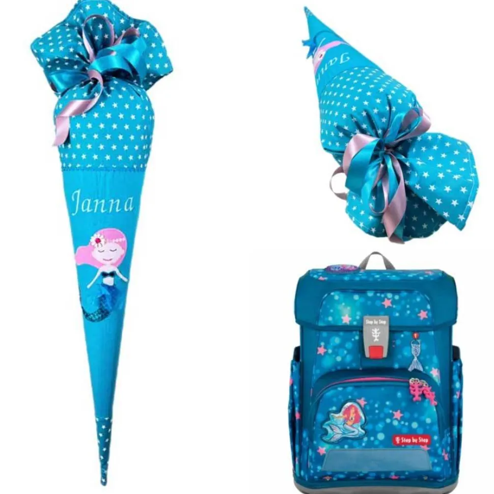Unserer Schultüte „Nixe“ überzeugt durch die zahlreichen Details der kleinen Meerjungfrau. Zum Beispiel sind ihre Schwanzflosse und ihr Oberteil aus glitzernden Schuppen gearbeitet und wir haben ihr einen farblich passenden Rock aus Tüll genäht. Die aufwendig aufgenähte, hüftlange Haarpracht schmückt ein verzierter Blumenschmuck. Seitlich haben wir ein zartes Organzaband mit kleinen Meeres Details angenäht, welches den Meerjungenfrauen Look der Schultüte komplettiert. Wir haben die Schultüte passend zum Step by Step Schulranzen Mermaid entworfen. Natürlich wird Deine personalisierte Zuckertüte auch von uns individuell mit Namen und, wenn gewünscht, Einschulungsdatum Deines Kindes bestickt. Dann kann die Einschulung ja kommen.