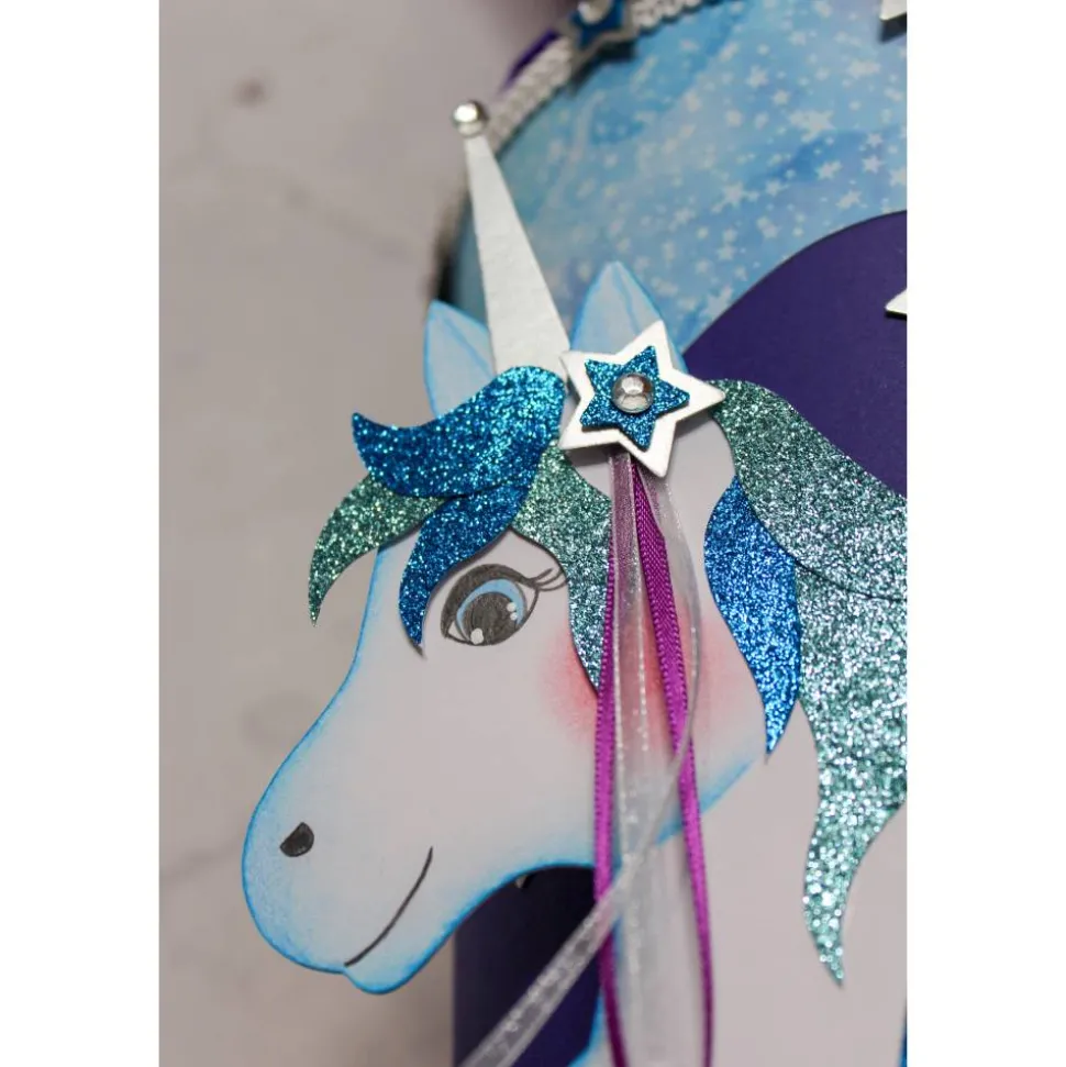 „Blue“ ist aus weißem Fotokarton, doppelt gefertigt. Die Mähne und der Schweif sind aus hellblau und türkisen Glitterkarton hergestellt. „Blues“ Flügel sind aus Fotokarton in flieder, Glitterkarton in türkis und lila gefertigt, in den Hufe spiegelt sich die Farbe wieder. Die Schleifen an der Mähne und dem Schweif, runden das harmonische Farbenspiel im Gesamtbild ab.