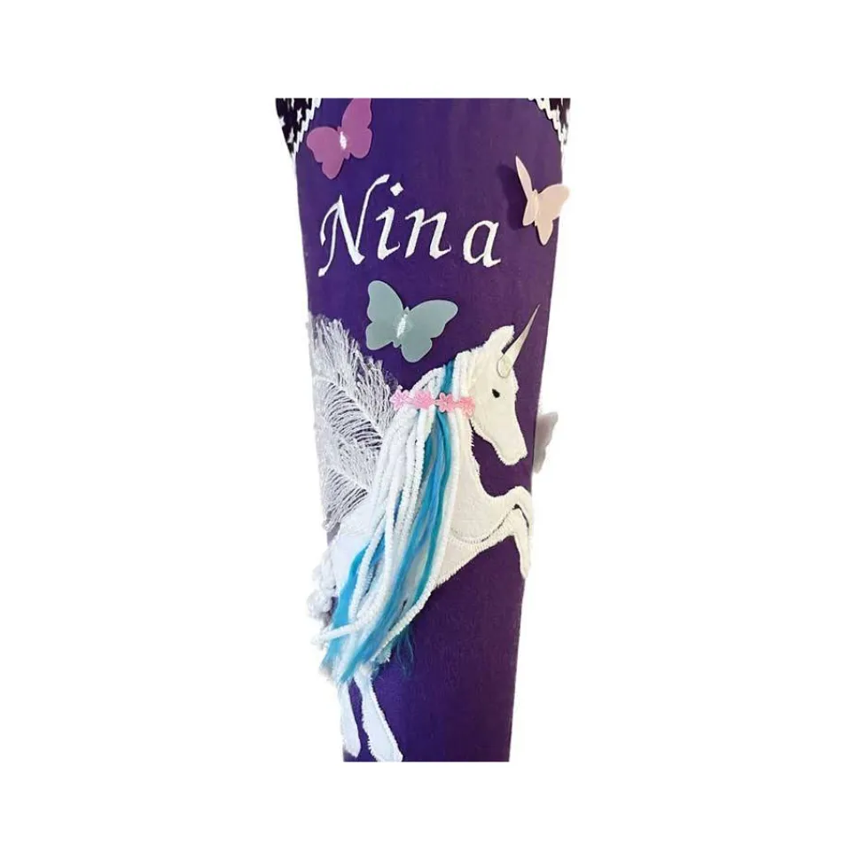 Für den Schulanfang haben wir viele neue Schultüten aus Stoff für Jungs und Mädchen entwickelt. Ab sofort können Sie unser Modell Schultüte Pegasus mit Namen personalisieren und bequem online kaufen. Wir haben die Pegasus Schultüte passend zum Step by Step Pegasus Schulranzen genäht. Sie passt aber auch wunderbar zum Ergobag Schulranzen Bärgasus. Die Applikation wird von uns aufwändig aufgenäht. Die Flügel des Pegasus sind aus Federn gearbeitet, die lange Mähne aus weißer Wolle mit türkisen Strähnen, auf der Stirn prangt ein silbernes Horn und der Schweif ist geflochten.