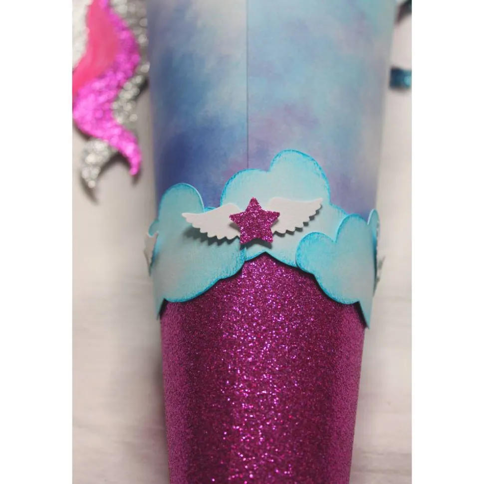 Der Schultütenrohling ist mit einem Motivkarton in Wölkchen, Aquarelloptik um klebt. Die Spitze ist aus einem Glitterkarton in pink gefertigt und eine weiße Holzspitze bildet den Abschluss. Die Manschette besteht aus drei Lagen. Ein besonderer Hingucker ist der weiße Tüll, mit silbernen Glitzerpartikeln, der das pastellblaue und pinkfarbene Krepppapier in den Hintergrund rückt. Verschlossen wird die Manschette mit einem weißen Satinband, weißer Kordel und einem Oraganzaband in pink. Rund um die Manschette und der Spitze reihen sich viele Wölkchen aneinander, die mit glitzernden Sternen und Engelsflügeln verziert sind.