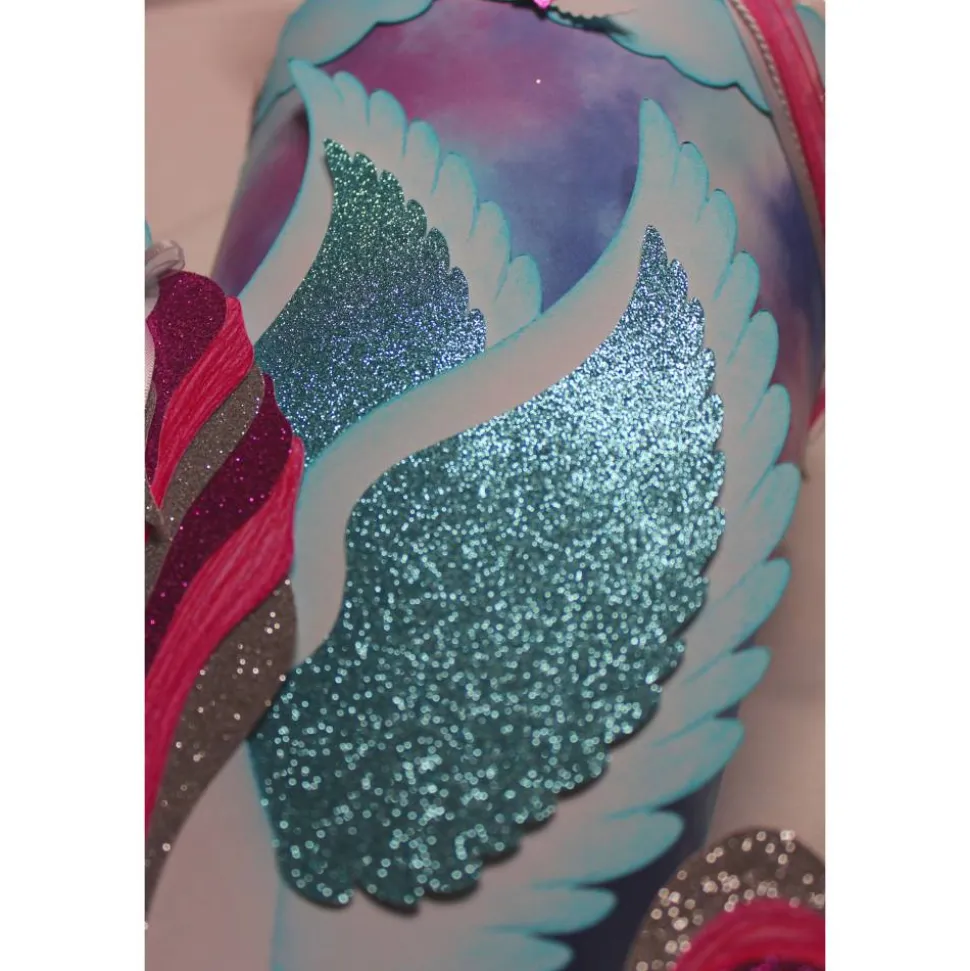 „Minou“ ist aus weißem Fotokarton, doppelt gefertigt. Die Mähne und der Schweif sind aus silbernem und pinkfarbenem Glitterkarton, rosa Fotokarton lockert die Optik auf. “Minous“ Flügel sind aus weißem Fotokarton und hellblauem Glitterkarton gefertigt. Die Hufe spiegeln den silbernen Glitterkarton wieder. Die Bänder an der Mähne und dem Schweif, runden das harmonische Farbenspiel im Gesamtbild ab.