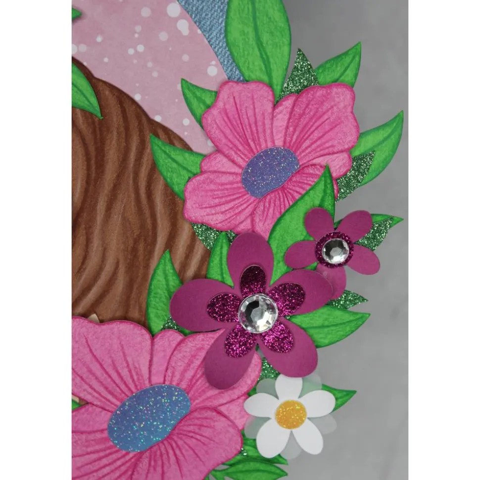 Die Motive sind aus Fotokarton, in verschiedenen Farben gefertigt, einzelne Elemente setzen sich unter anderem aus Glitterkarton in rosa und violett ab, die Herzen und ein Teil der Blüten sind zusätzlich mit Schmucksteinen verziert.