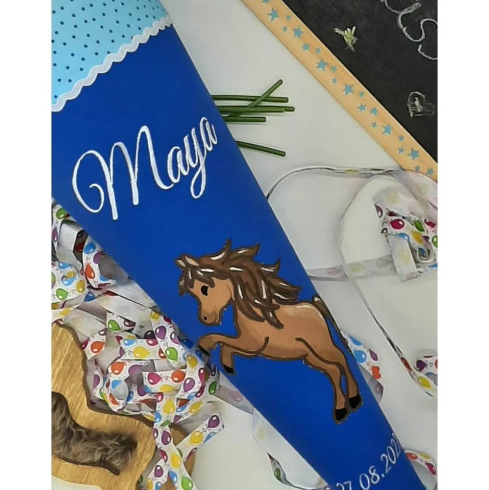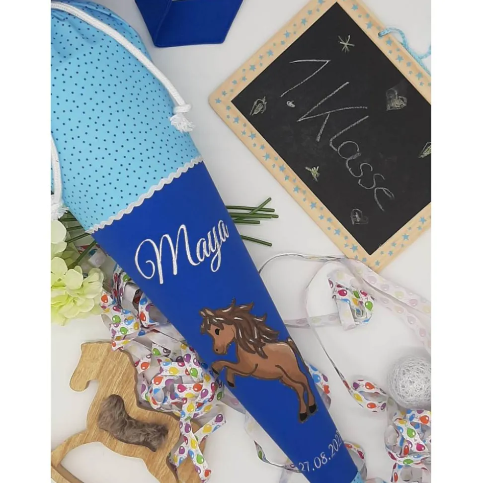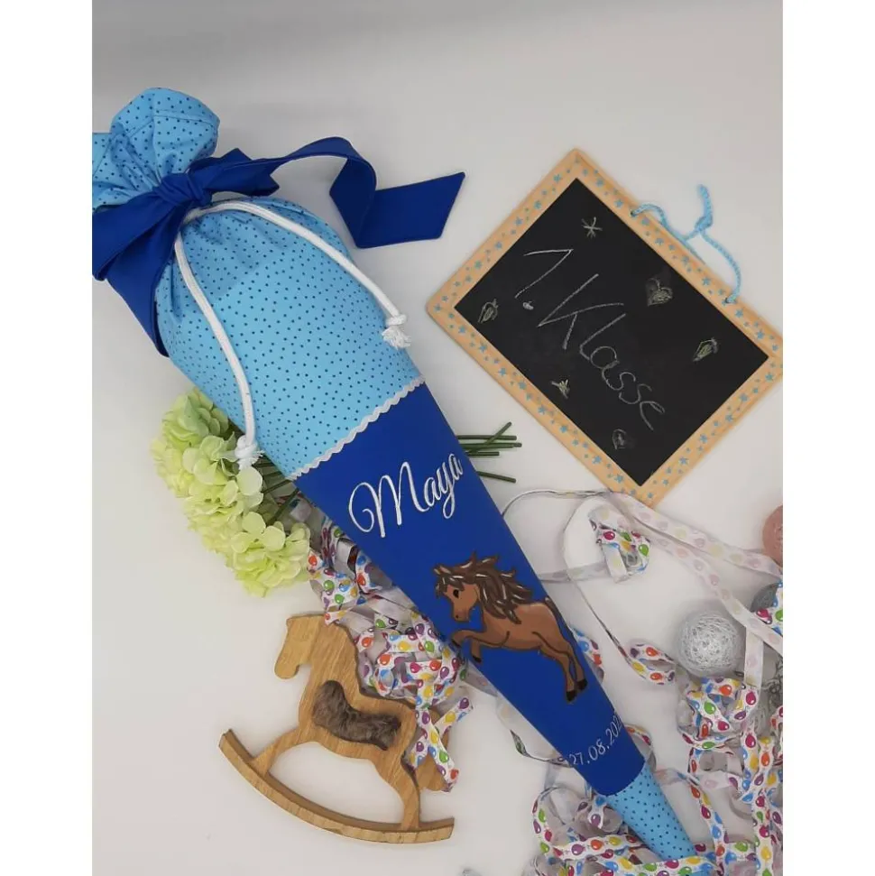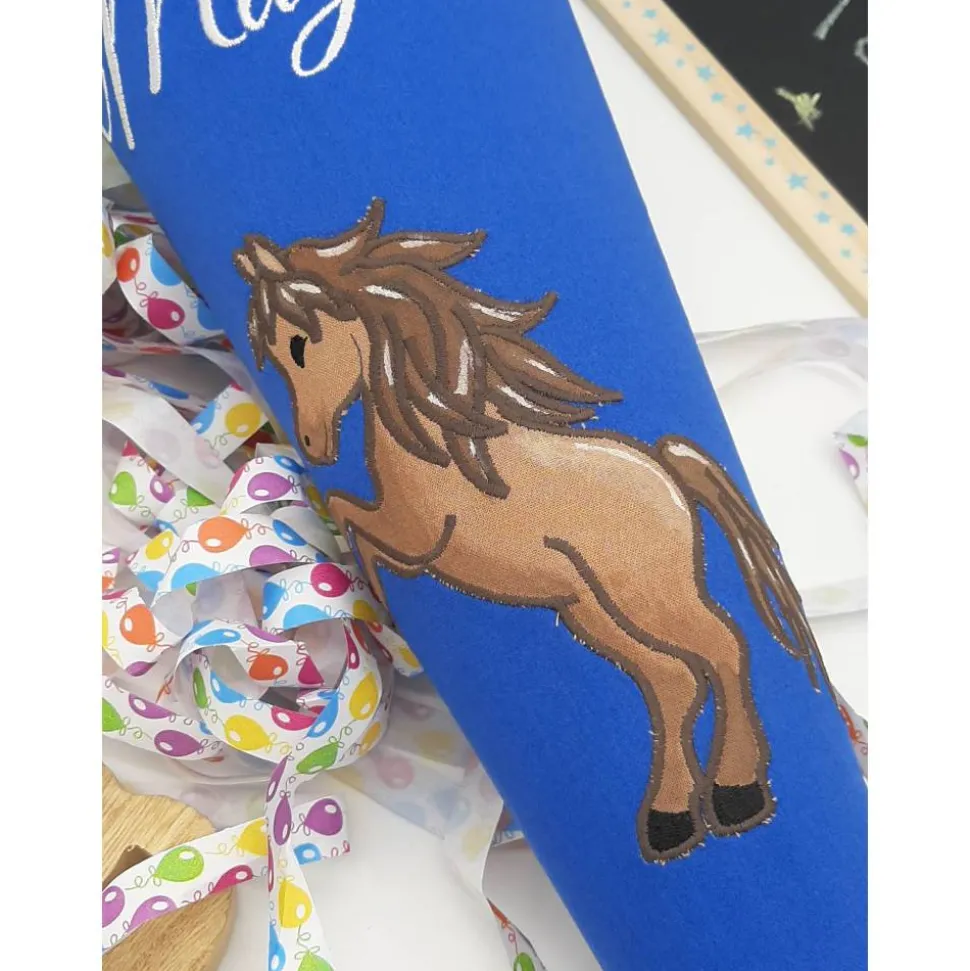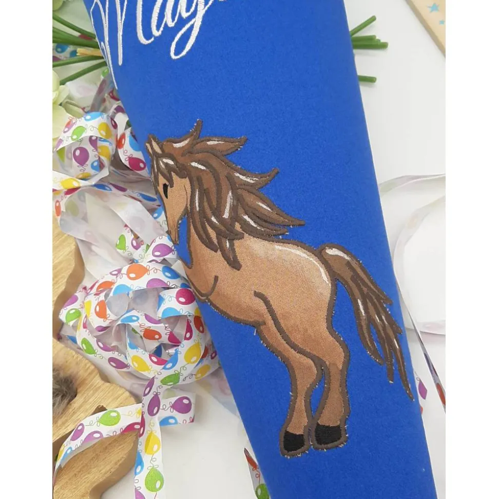 Hier bekommtst du eine klassisch runde Schultüte mit einer tollen Stickerei.