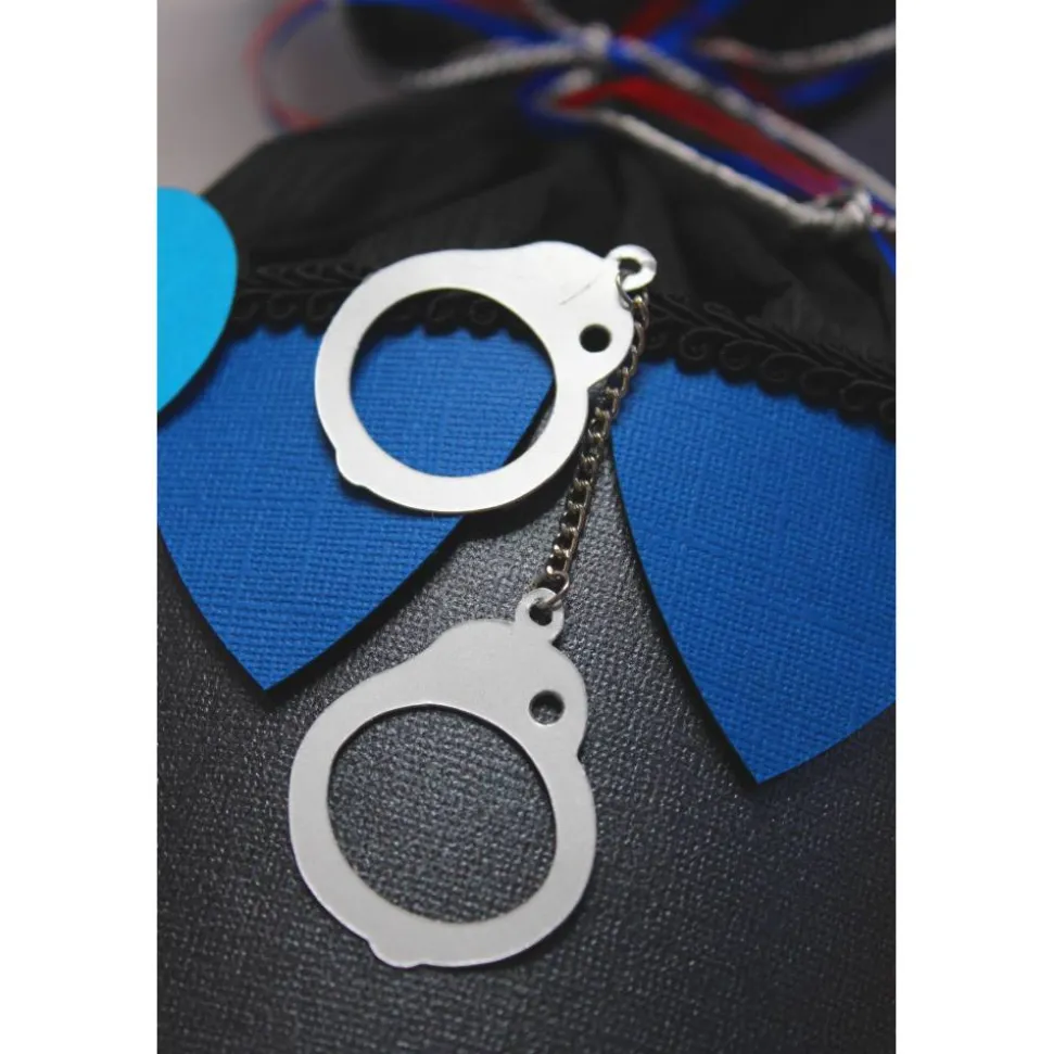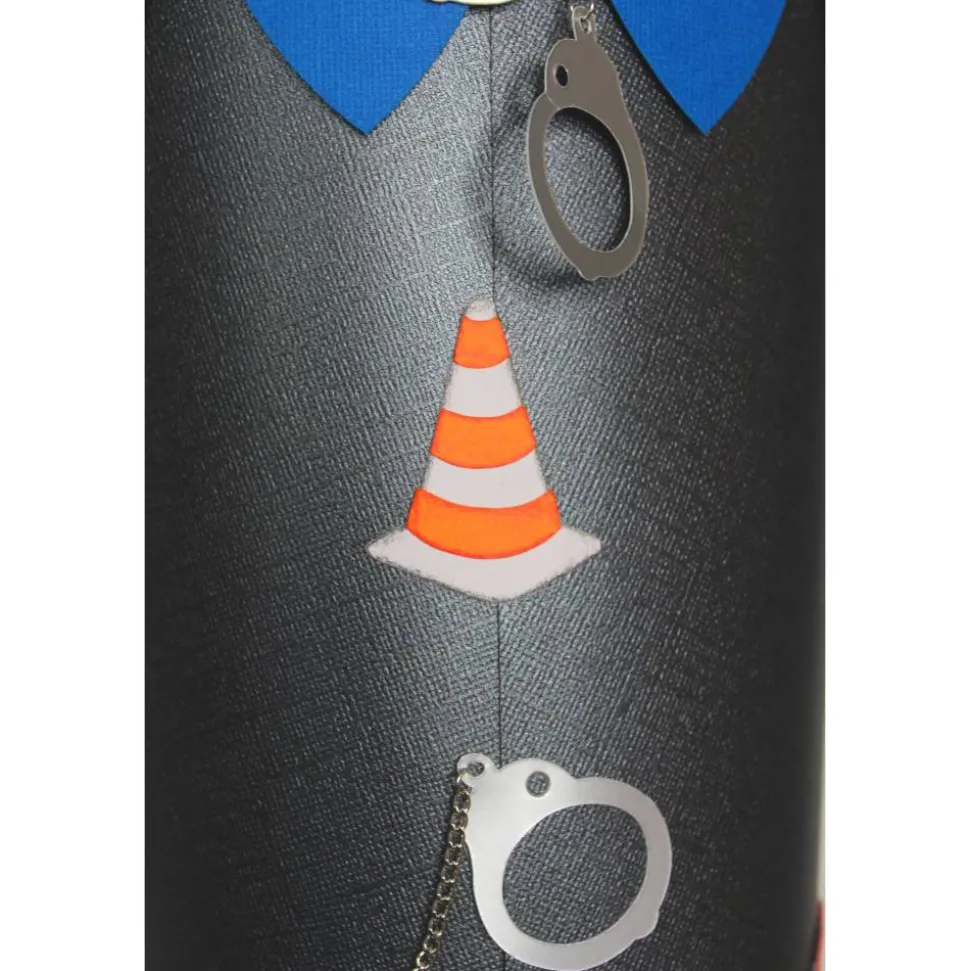 Der Schultütenrohling ist mit einem leicht glänzenden, schwarzen Strukturkarton um klebt. Die Spitze und die Ornamente am Manschettenrand, sind aus einem blauen Strukturkarton abgesetzt. Die Manschette ist aus blauem und schwarzem Krepppapier gefertigt und wird mit einem blauen Satinband, einer silbernen Kordel und rotem Organzaband verschlossen. Für einen sauberen Übergang sorgt eine schwarze Bordüre, eine rote Holzspitze bildet den Abschluss. Verschiedene Verkehrszeichen, sowie Handschellen aus Fotokarton verzieren den Manschettenrand und die Spitze.
