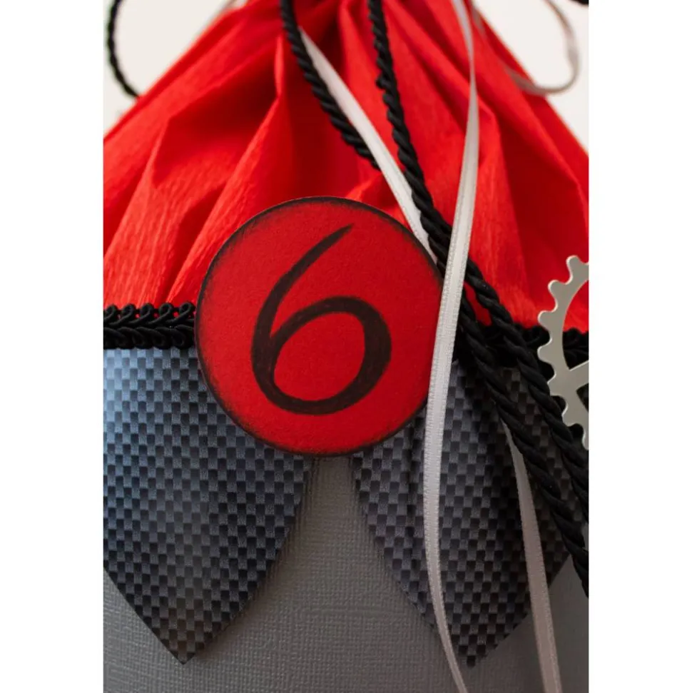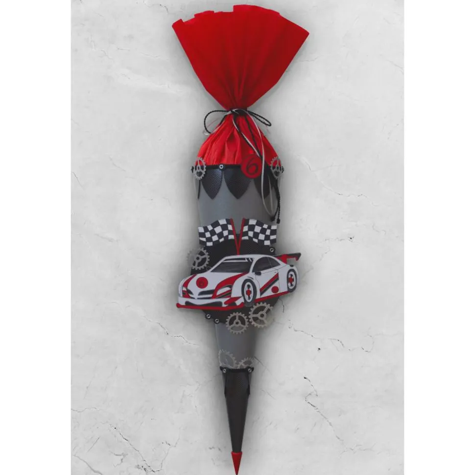 Das “Rennauto“ ist ein absoluter Hingucker. Es ist in liebevoller Detailarbeit aus Fotokarton in weiß, rot und schwarz, plastisch gefertigt. Das „Rennauto“ ist auf einem verstärkten Kreis aus Fotokarton befestigt, die Folie in Carbon Optik spiegelt sich hier wieder. Auch hier finden sich Zahnräder, Schraubmuttern und Rennflaggen wieder und runden das harmonische Gesamtbild der Schultüte ab.