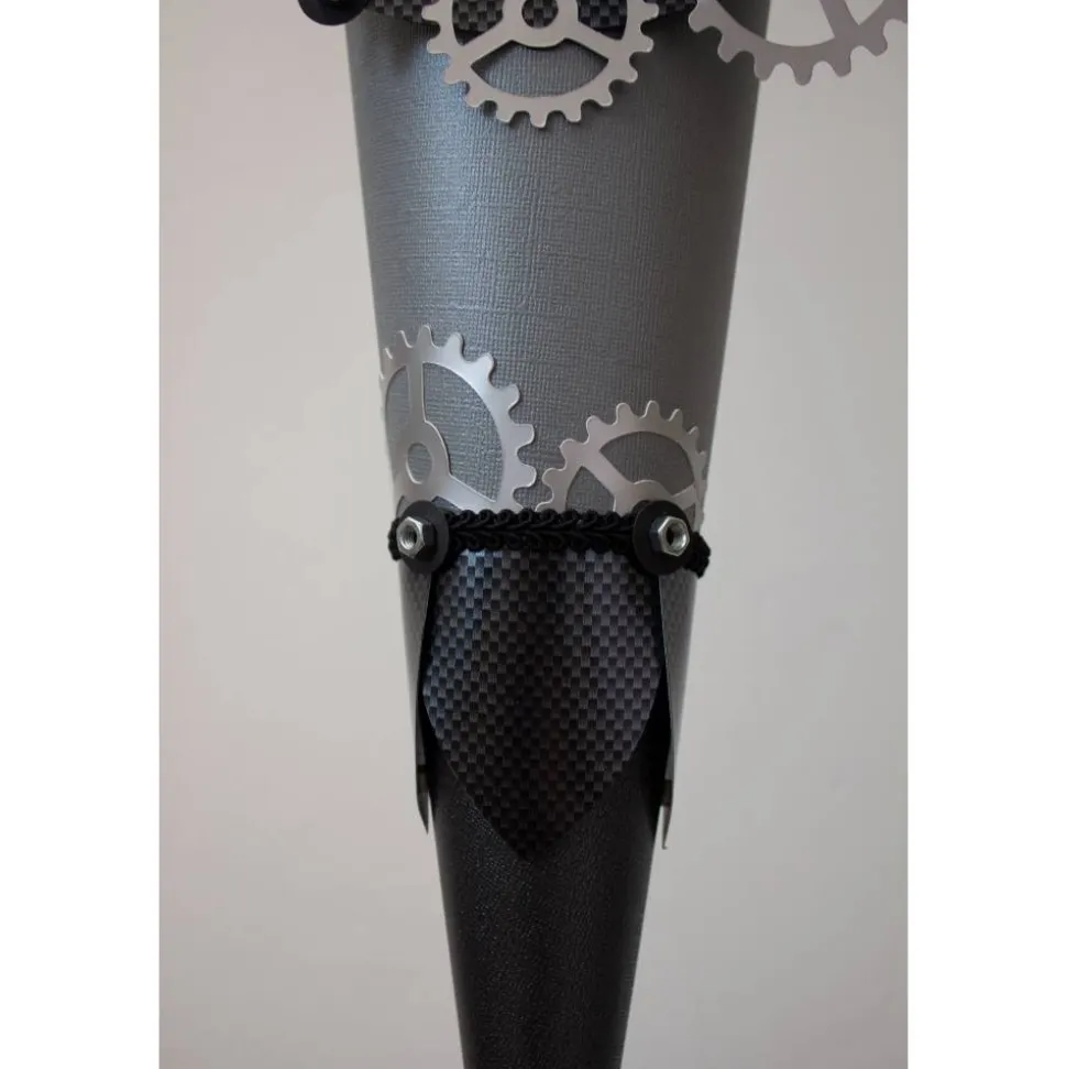 Der Schultütenrohling ist mit einem leicht glänzenden, grauen Strukturkarton um klebt. Die Spitze ist aus schwarzem Fotokarton abgesetzt. Die Ornamente am Manschettenrand und an der Spitze sind aus Folie, in Carbon Optik, gefertigt und mit Fotokarton verstärkt. Die Manschette ist aus rotem Krepppapier gefertigt und wird mit einem grauen Satinband und einer schwarzen Kordel verschlossen. Für einen sauberen Übergang sorgt eine schwarze Bordüre, eine rote Holzspitze bildet den Abschluss. Eine Verzierung mit kleinen Schraubmuttern und silbernen Zahnrädern, aus Fotokarton, reiht sich um den Schultütenrohling.