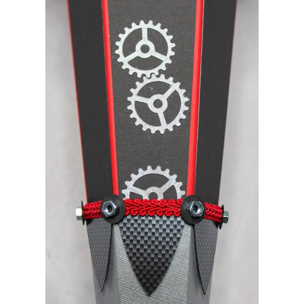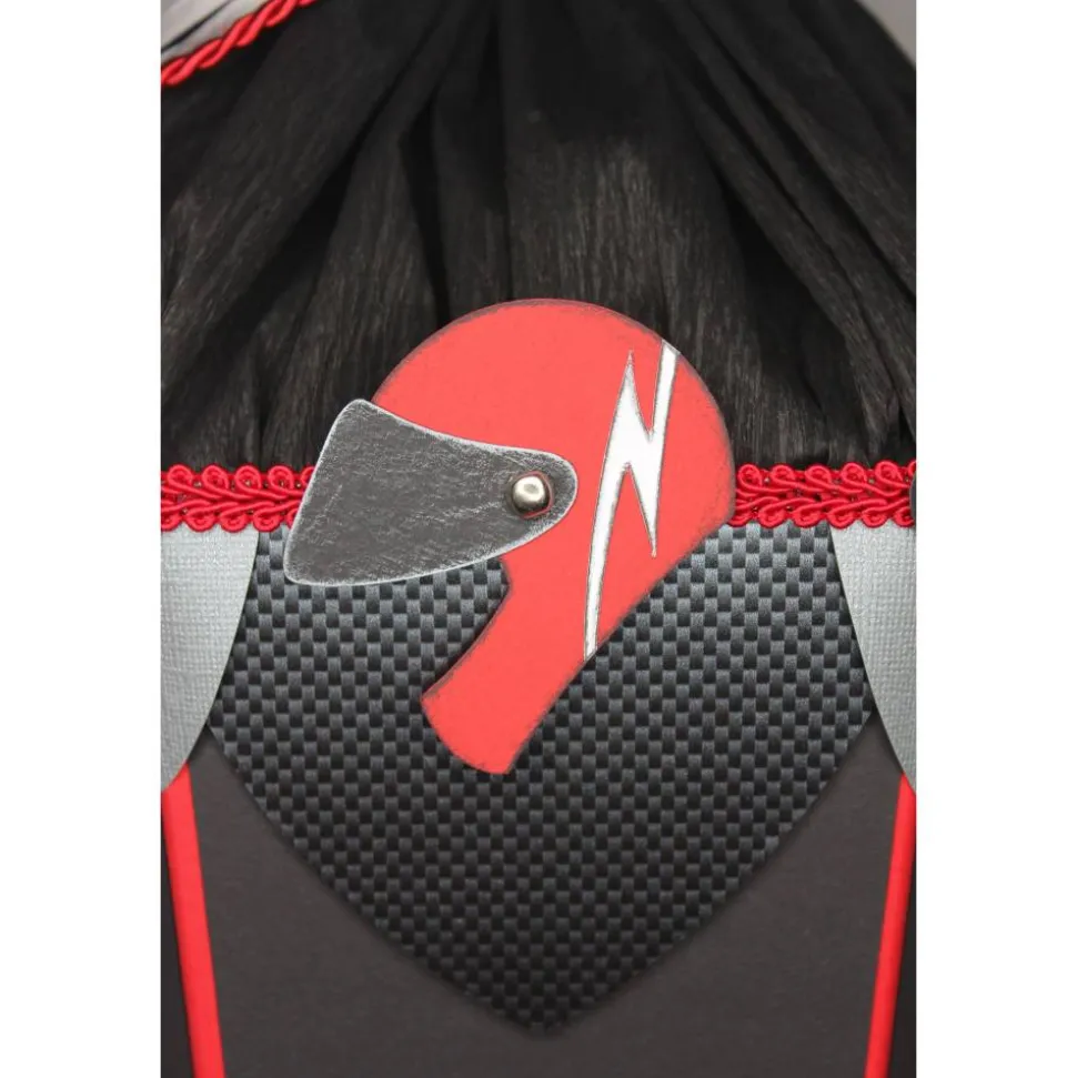 Für einen sauberen Übergang sorgt eine rote Bordüre, eine rote Holzspitze bildet den Abschluss. Der Manschettenrand ist mit silbernen Zahnrädern aus Fotokarton, Rennflaggen, Sturzhelmen und kleinen Schraubmuttern verziert, die Schraubmuttern finden sich auch an der Spitze wieder.
