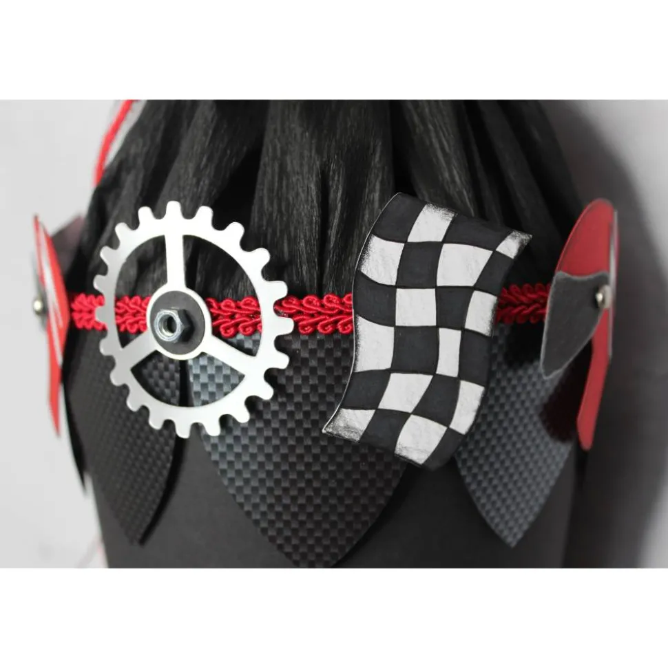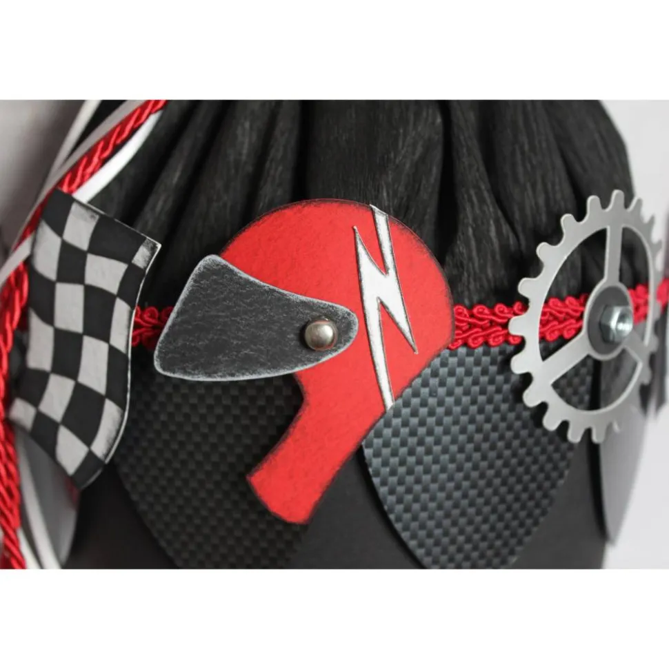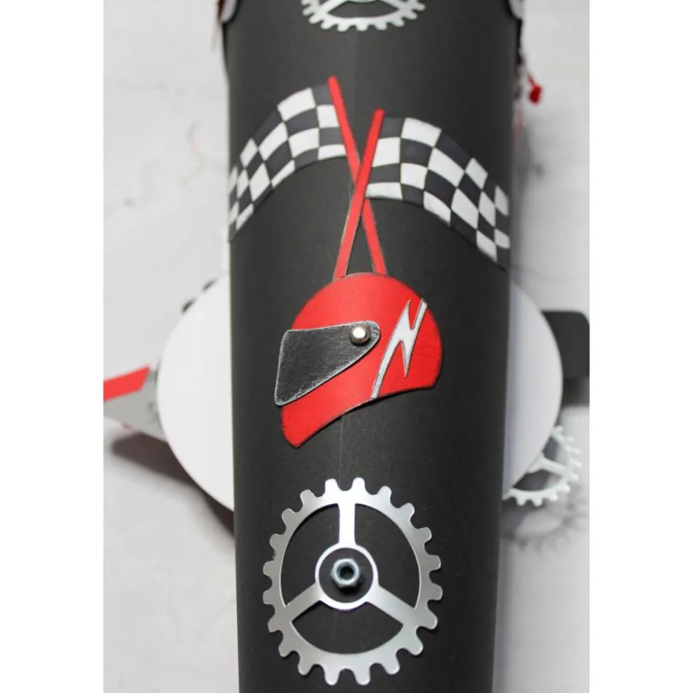 Für einen sauberen Übergang sorgt eine rote Bordüre, eine rote Holzspitze bildet den Abschluss. Der Manschettenrand ist mit silbernen Zahnrädern aus Fotokarton, Rennflaggen, Sturzhelmen und kleinen Schraubmuttern verziert, die Schraubmuttern finden sich auch an der Spitze wieder.