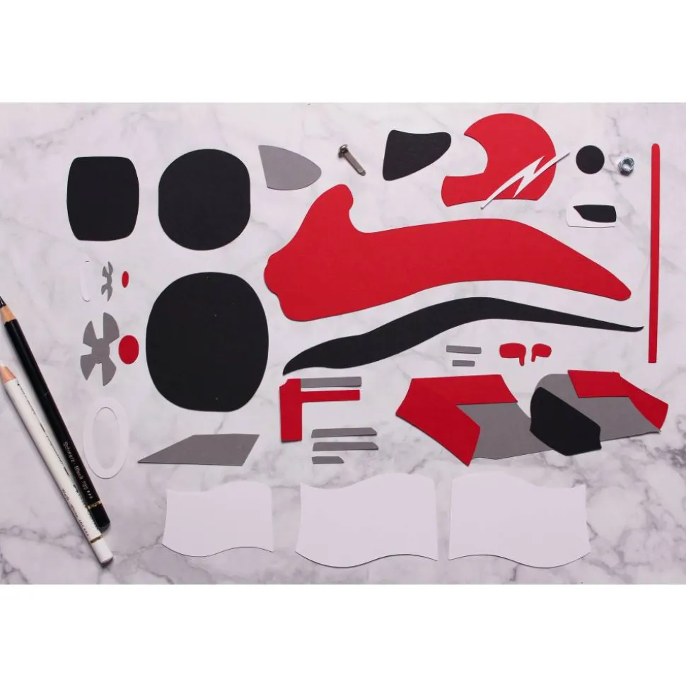 Der Rennwagen „KA 1“ ist ein absoluter Hingucker. Er ist in liebevoller Detailarbeit aus Fotokarton in weiß, rot, grau und schwarz, plastisch gefertigt.