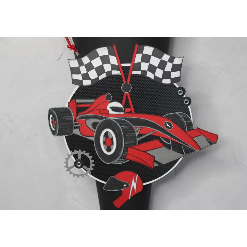 Der Rennwagen ist auf einem verstärkten Kreis aus Fotokarton befestigt und bietet so mehr Stabilität auf der Schultüte, die Folie in Carbon Optik spiegelt sich hier wider, ebenso einzelne Elemente.