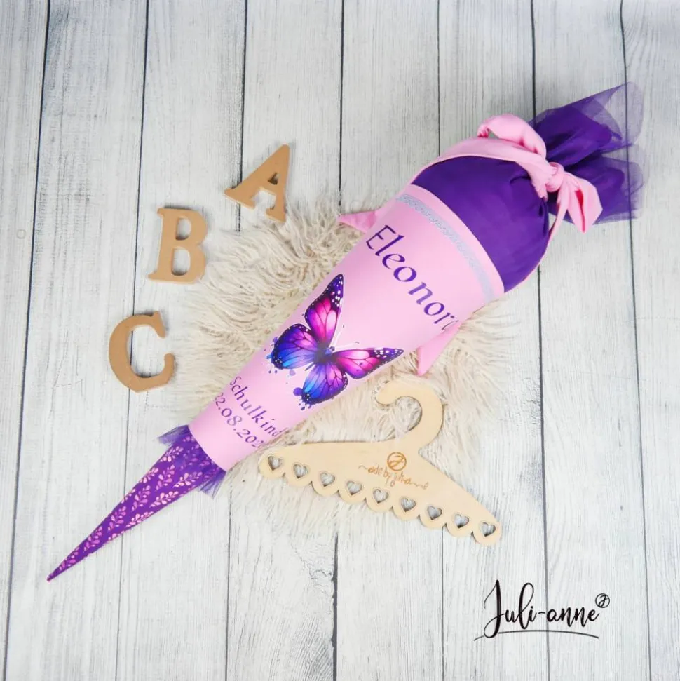 Schultüte aus Baumwolle mit verschiedenen dekorativen Details. Der Schmetterling ist ein Bügelbild ❣️ Die Krempe hat zusätzlich zwei Lagen Tüll.