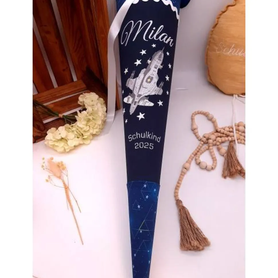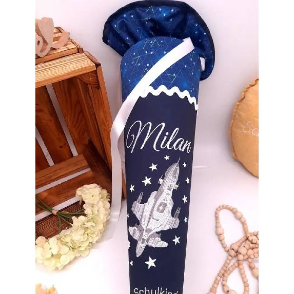 Die Schultüte wird mit dem Namen des Kindes und z.B. Schulkind 202* bestickt.