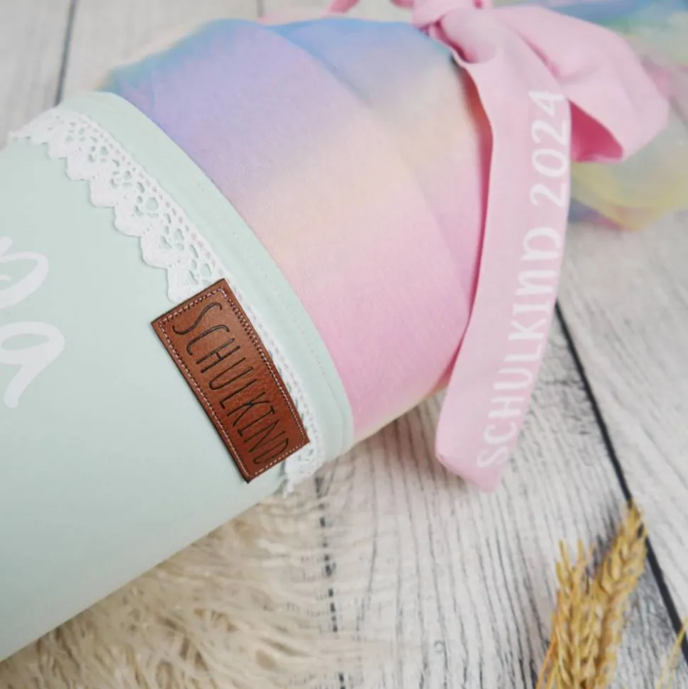 Schultüte aus Baumwolle mit verschiedenen dekorativen Details und Tüll.