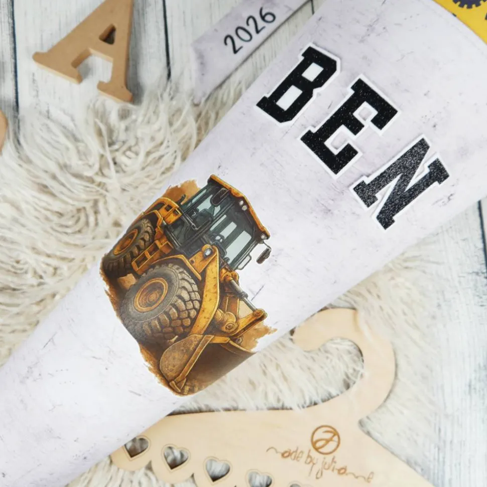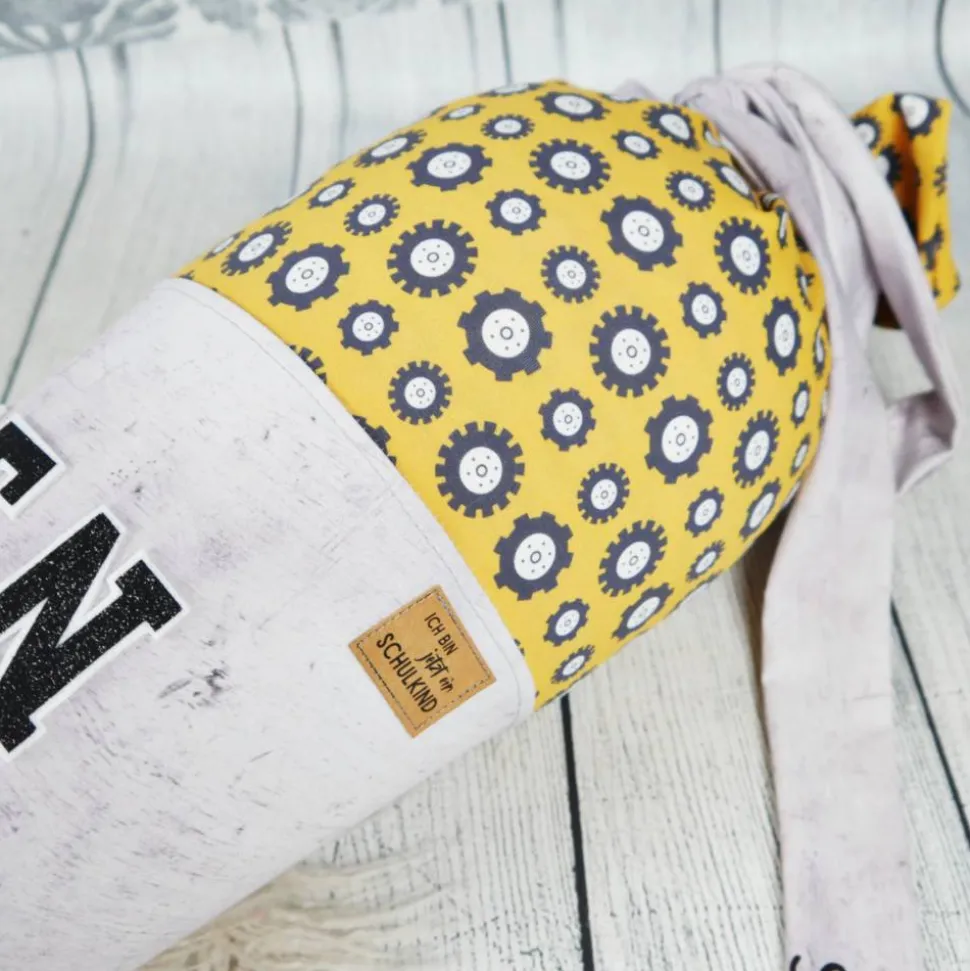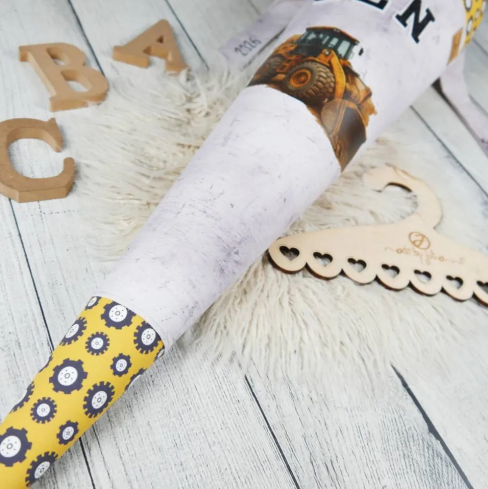 Schultüte Stoff Bulldozer Bagger Grau Gelb 70cm 85cm   *personalisierbar und mit Kisseninlet