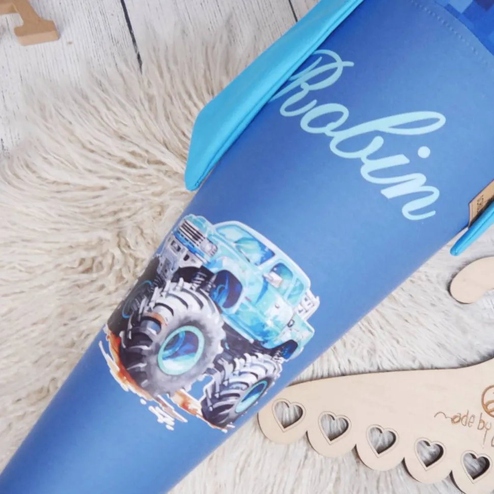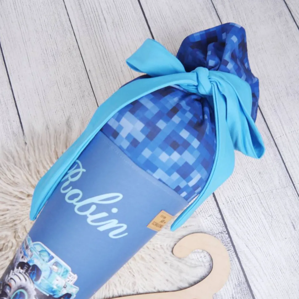 Schultüte Stoff Monstertruck Türkis Pixel 70cm 85cm   *personalisierbar und mit Kisseninlet