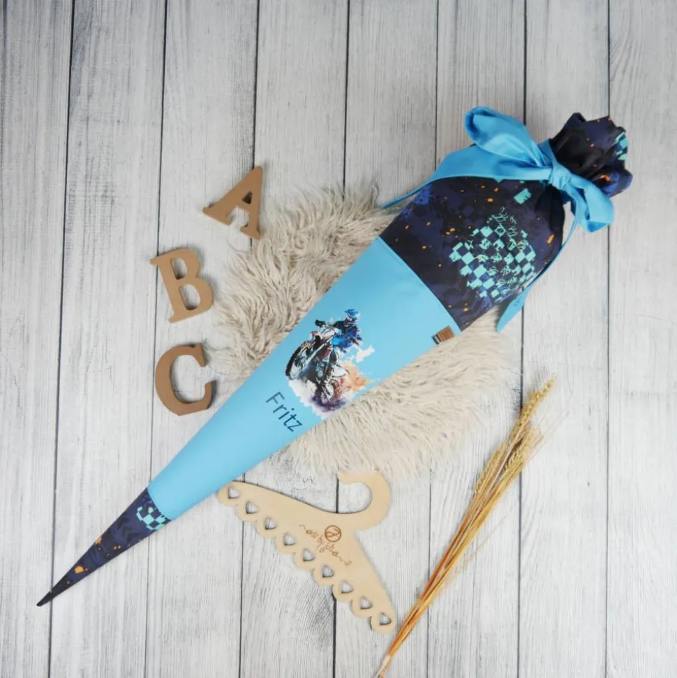 Schultüte Stoff Motocross Türkis Blau  70cm 85cm   *personalisierbar und mit Kisseninlet