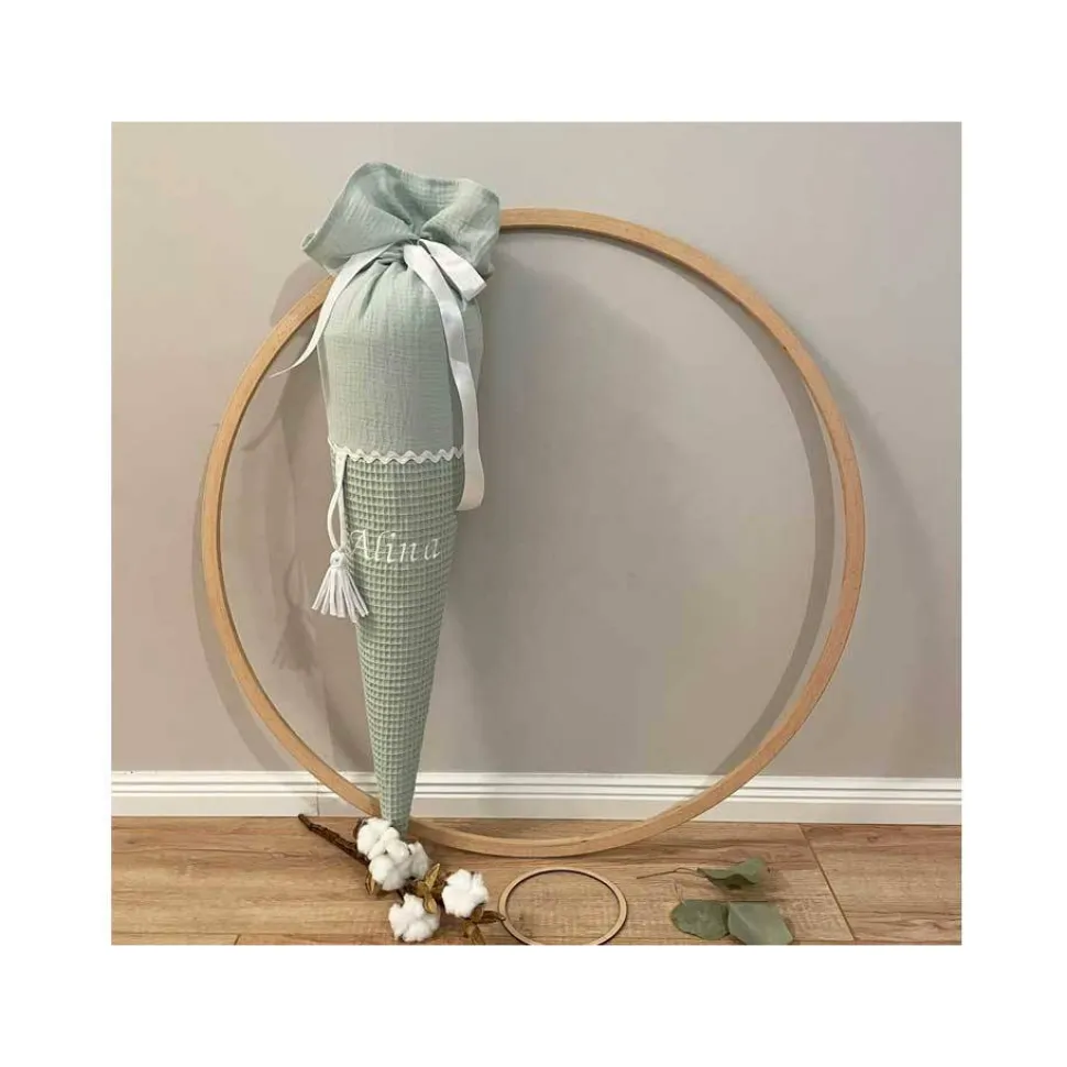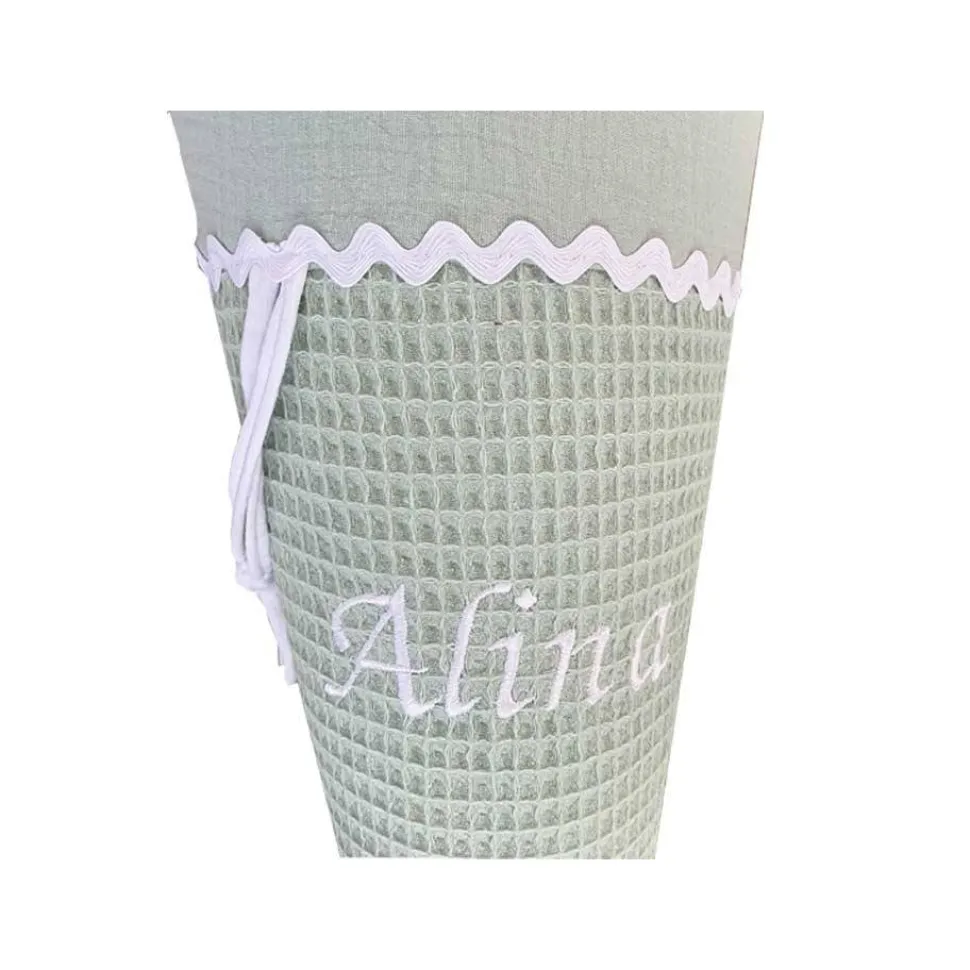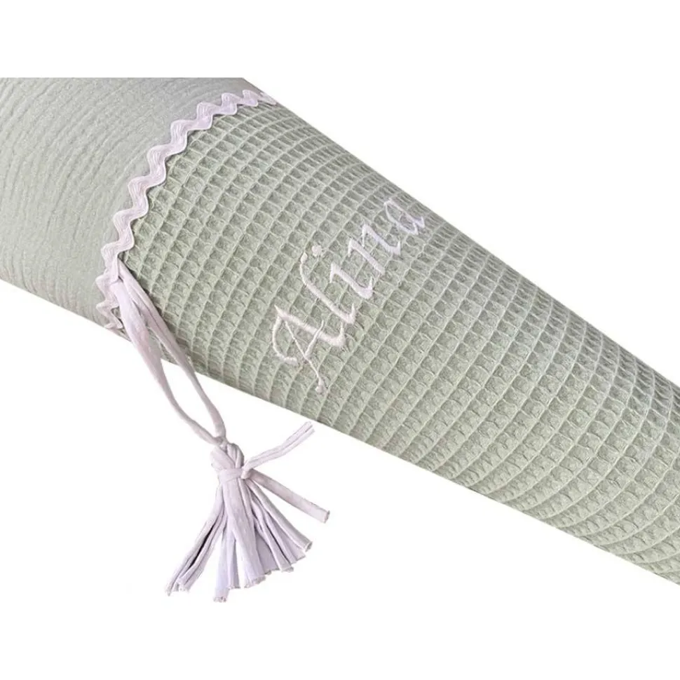 Unsere Schultüte Waffelpique mit Namen überzeugt durch ihr schlichtes und zeitloses Design. Wir bieten diese Stoff Schultüte in vier zarten Pastellfarben – passend für Jungen und Mädchen – an. Die Tülle unserer Schultüte Waffelpique mit Namen ist aus zartem Musselin gearbeitet, der sich im Hauptteil beim Waffelpique widerholt. Der Blickfang sind schlichte Details, wie die breite Zackenborte und die Quaste in weiß passend zum eingestickten Namen. Natürlich wird Ihre persönliche Schultüte auch von uns individuell mit Namen und Einschulungsjahr bestickt. Damit wird der Schulanfang zu einem perfekten Ereignis!