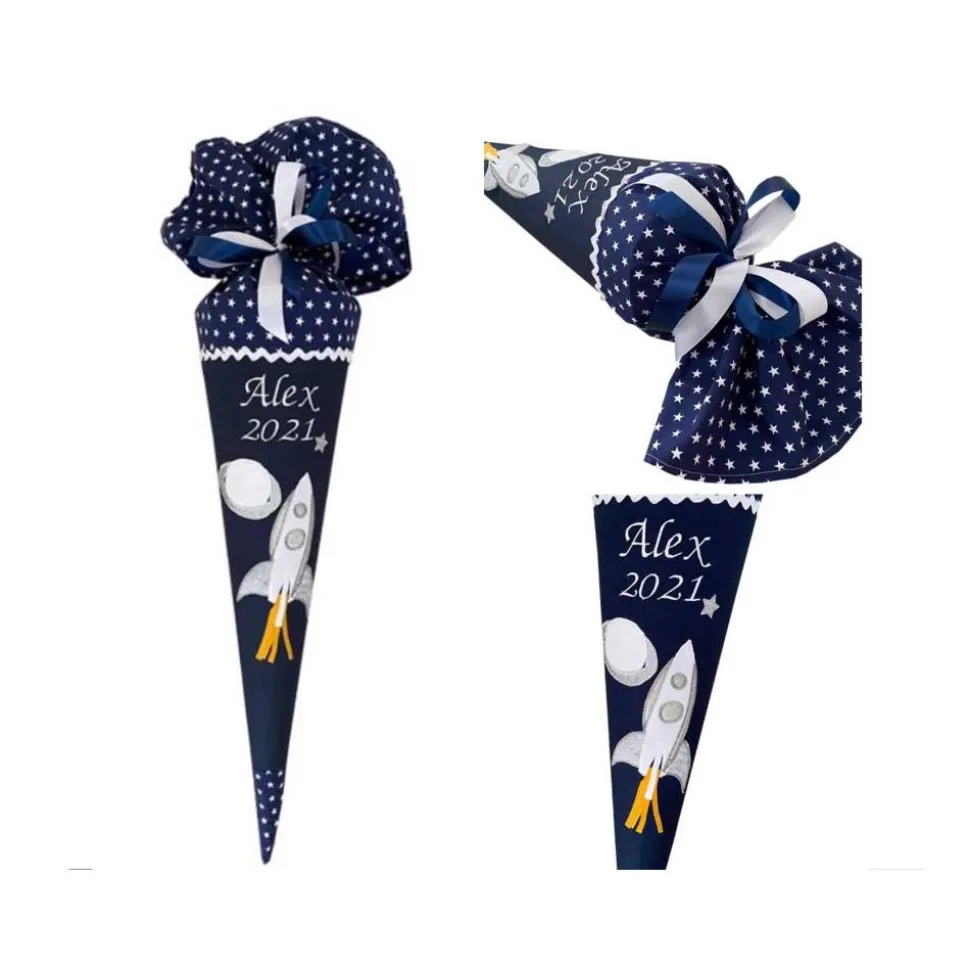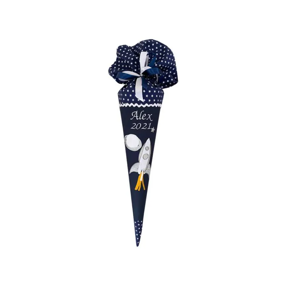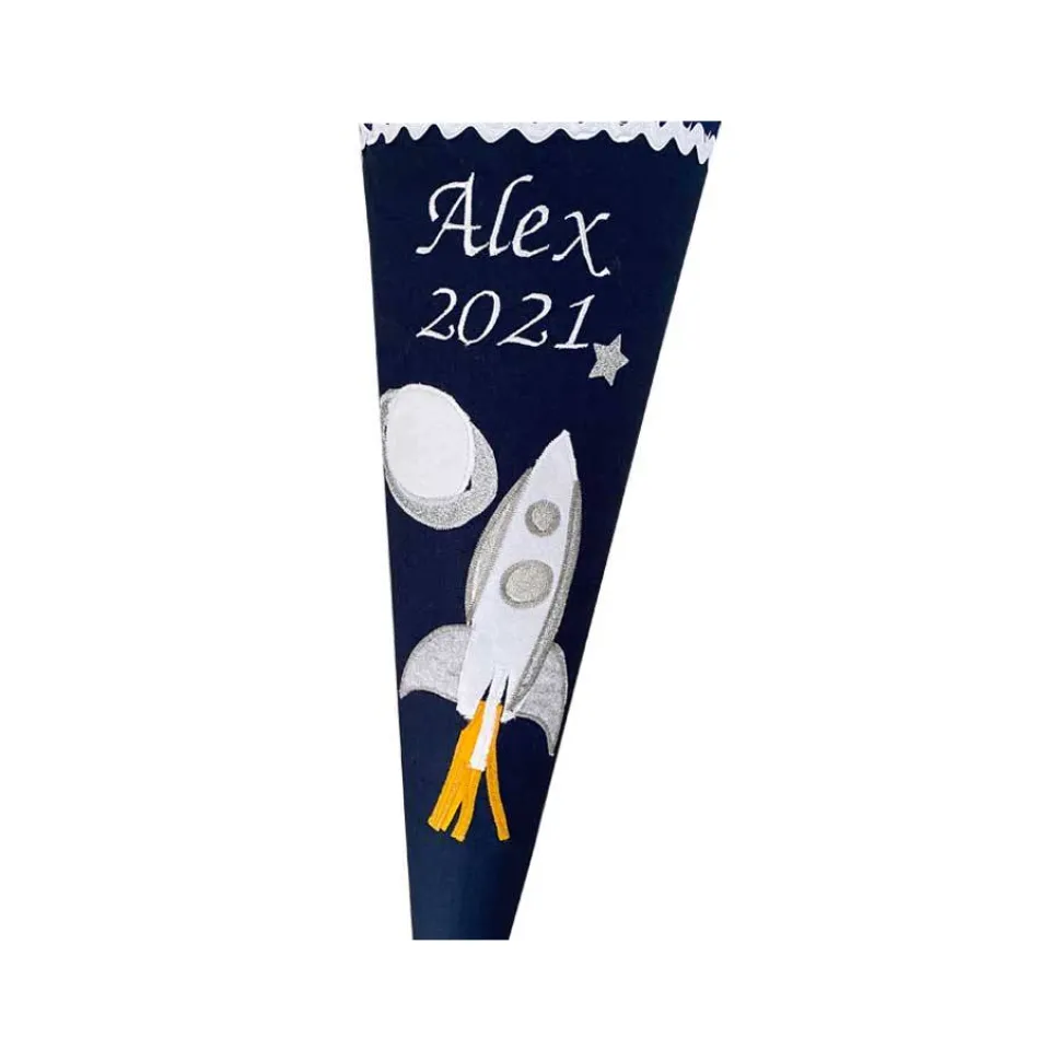 Auf unserer Schultüte “Weltraum” fliegt eine Rakete mit Feuerschweif und silbernen Glitzerdetails an einem Planeten vorbei. Die Rakete ist besonders detailreich auf appliziert und sie ist umgeben von kleinen, silbernen Sternen. Natürlich wird Ihre personalisierte Zuckertüte auch von uns individuell mit Namen und, wenn gewünscht, Einschulungsdatum Ihres Kindes bestickt. Für kleine Astronauten ein Must-Have zum Schulanfang!